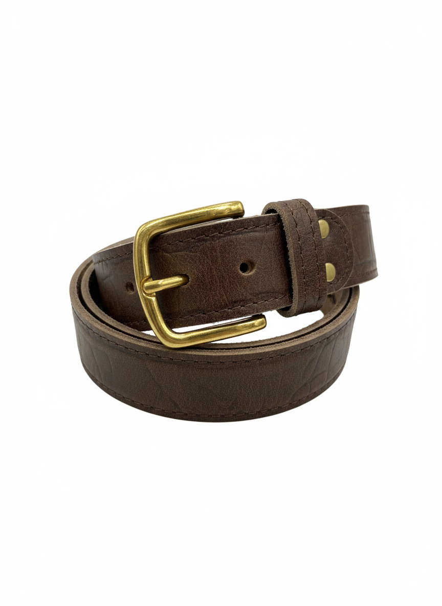 Elevate your everyday style with this versatile brown textured belt, finished with a striking gold buckle that adds a touch of sophistication to any outfit.