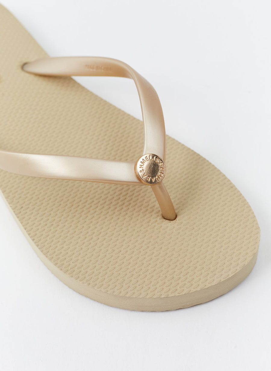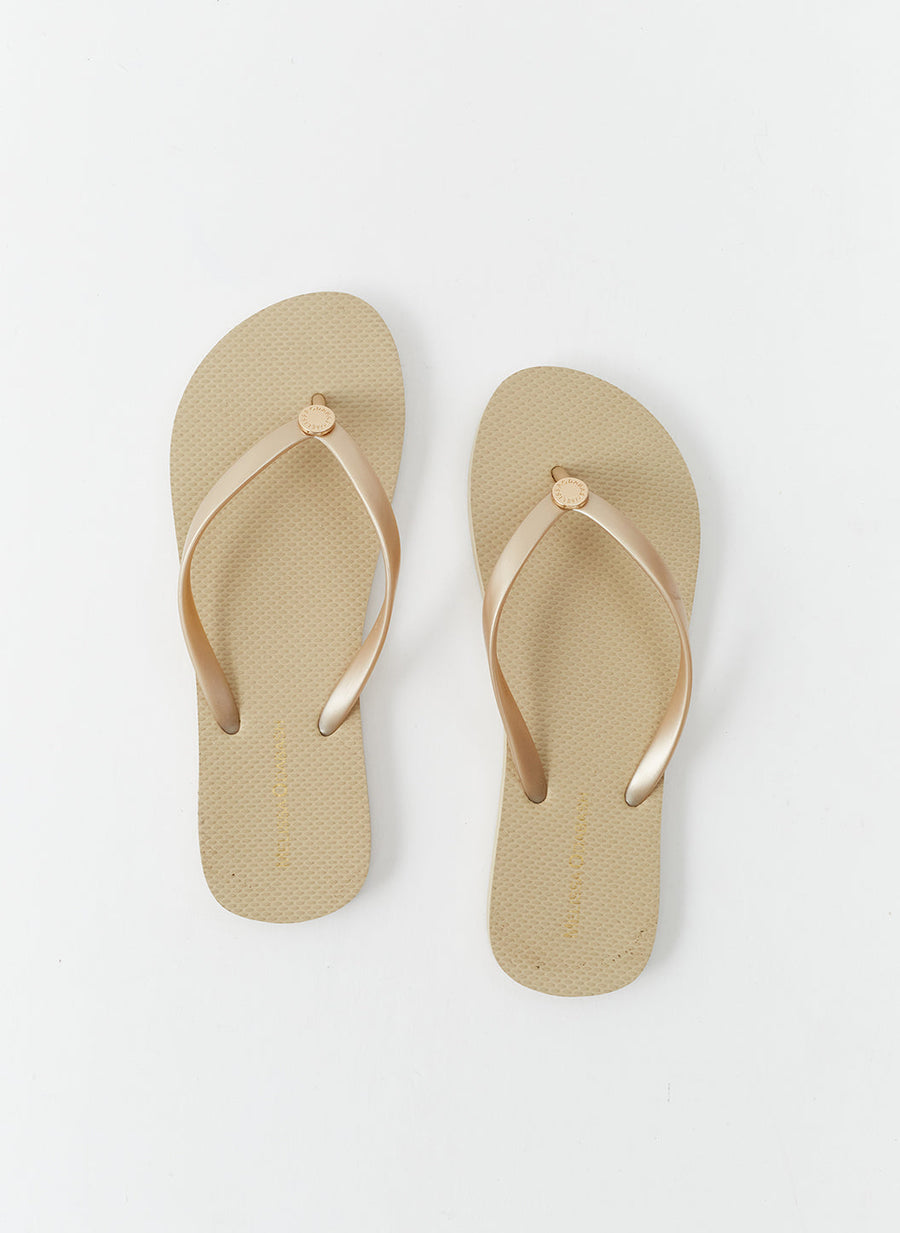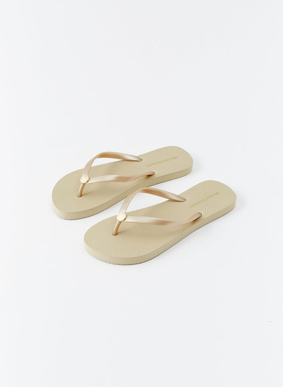 For those who favour minimalist design, this seasons exclusive Rubber Flip Flops are an essential addition to your summer wardrobe. In a unique metallic shade of Gold this understated pair of sandals are crafted from lightweight, comfortable rubber. Casual yet elegant, this style is finished with gold-tone hardware at the base of the pvc toe post cementing their luxury status.