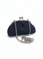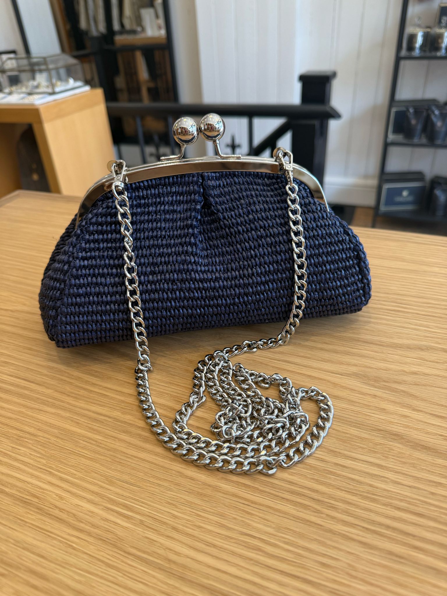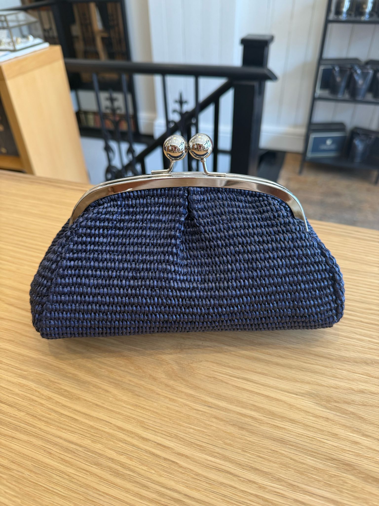 Elevate your everyday carry with this charming small raffia pouch in classic navy.