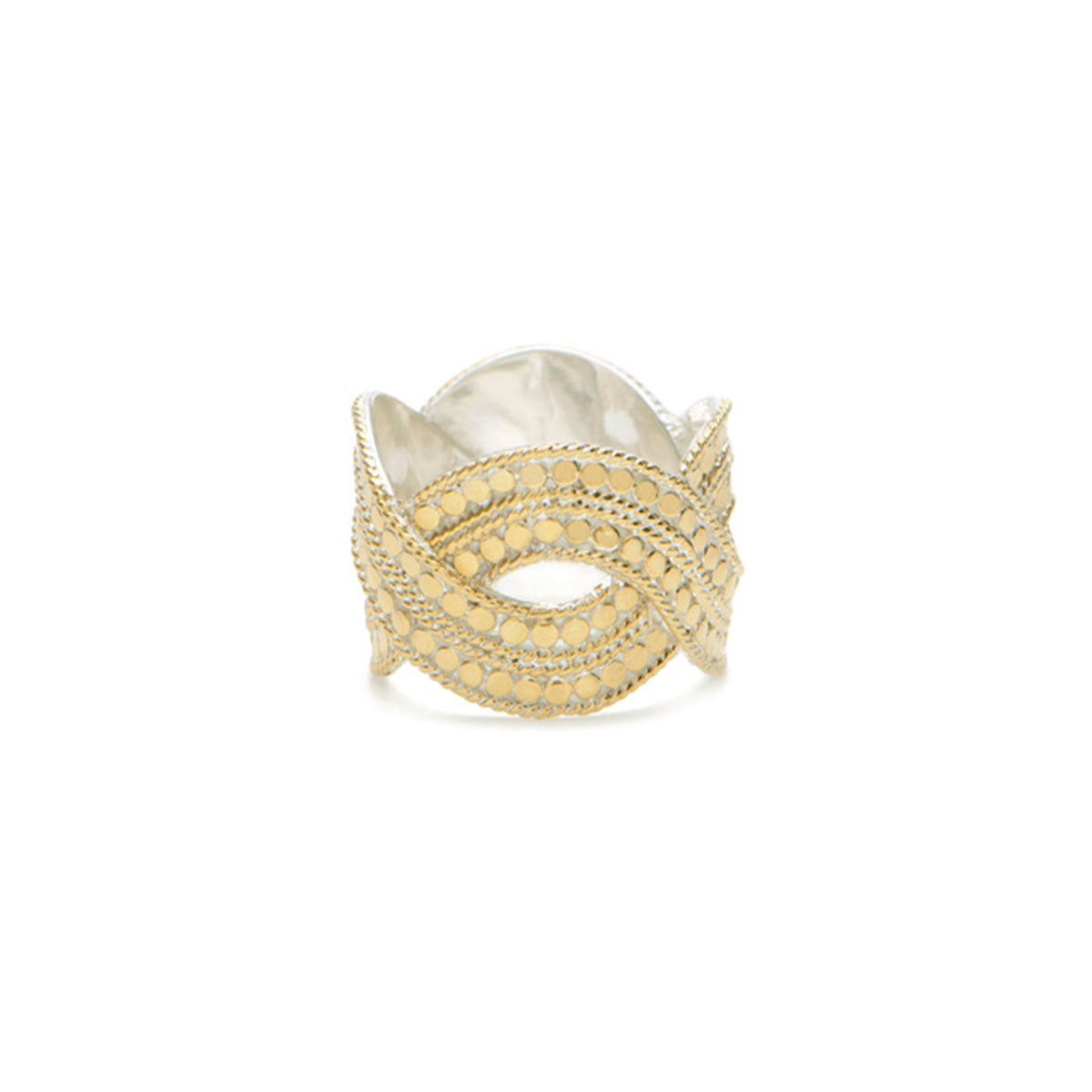 Take a moment to take in the intricate design of our woven band ring. Two layers of handcrafted gold braiding and dotting work create dynamic movement, infinitely intertwined as a reminder that connectedness is forever.