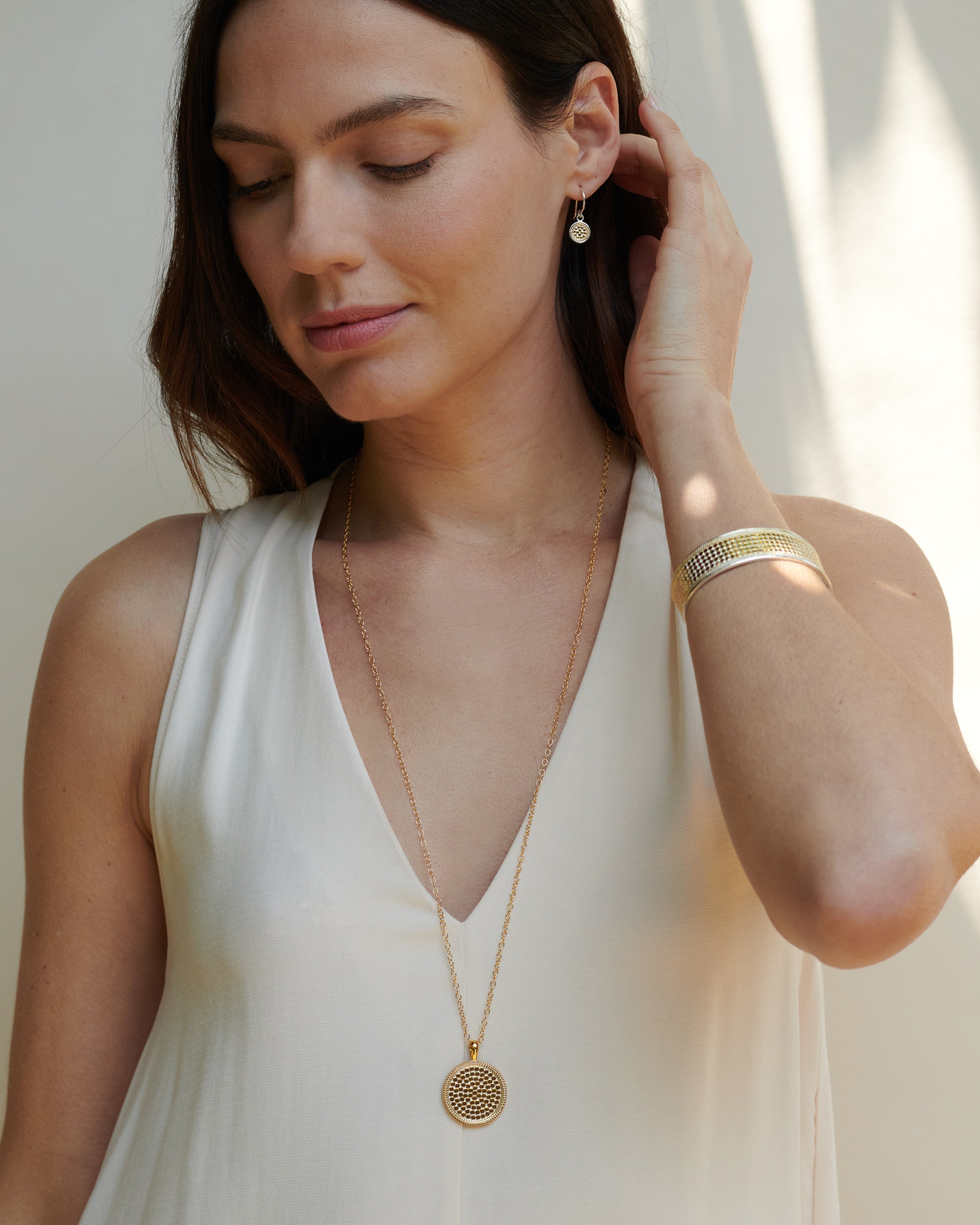A stunning display of Balinese metalsmithing—each dot is punched and set by hand, a generations-old technique that infuses our designs with love and intention. Our large-format gold pendant is perfect for statement-making.