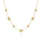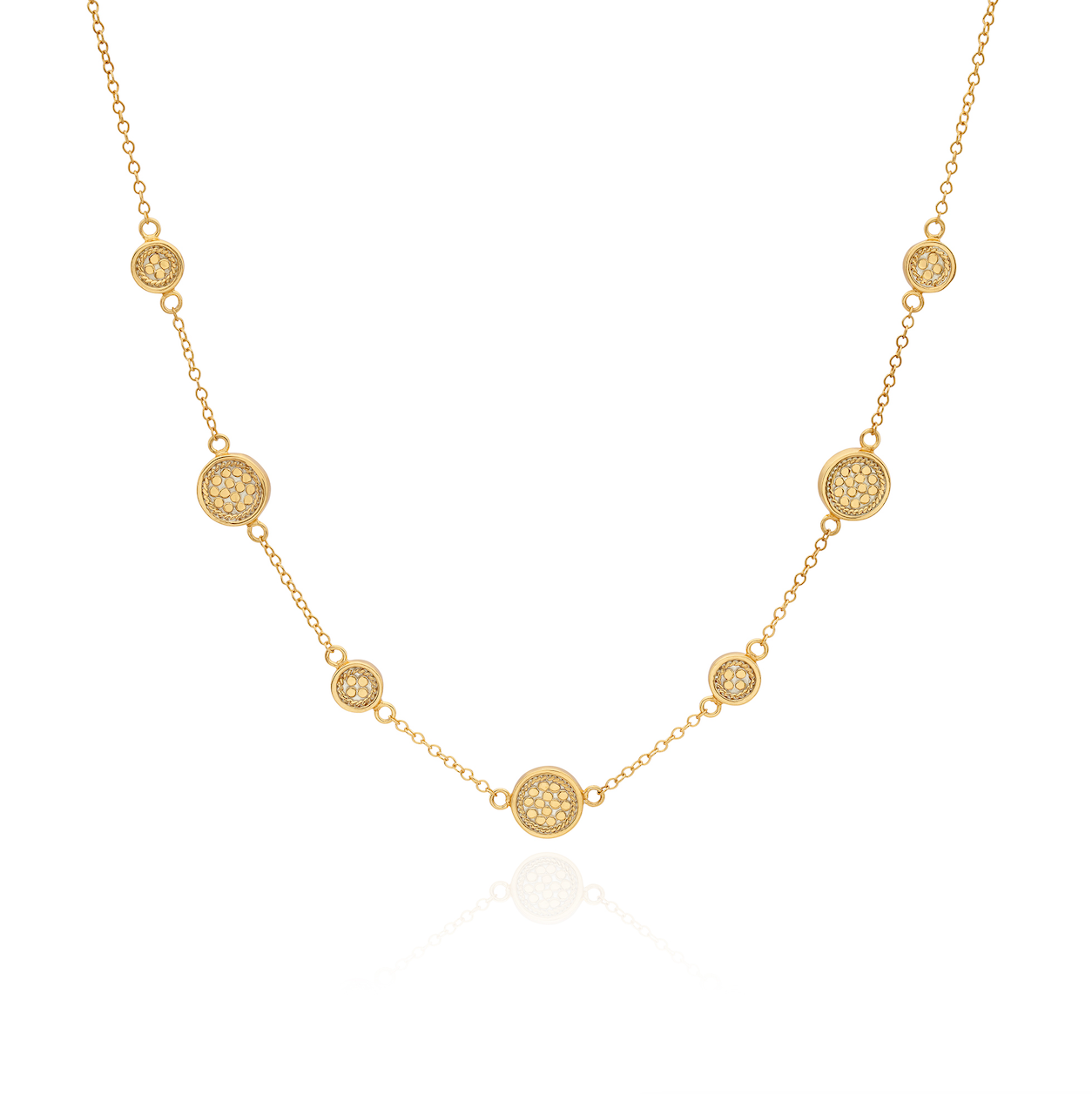 The station necklace is a forever classic, perfect for layering but able to hold its own when worn solo. Our Classic Station Necklace features warm gold disks adorned with our signature gold dotting work, alternating in size for added movement.