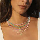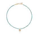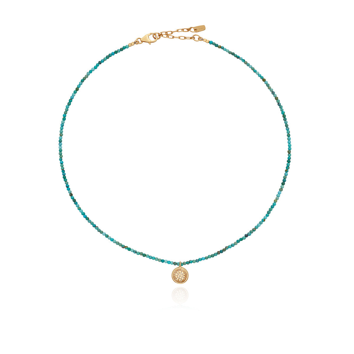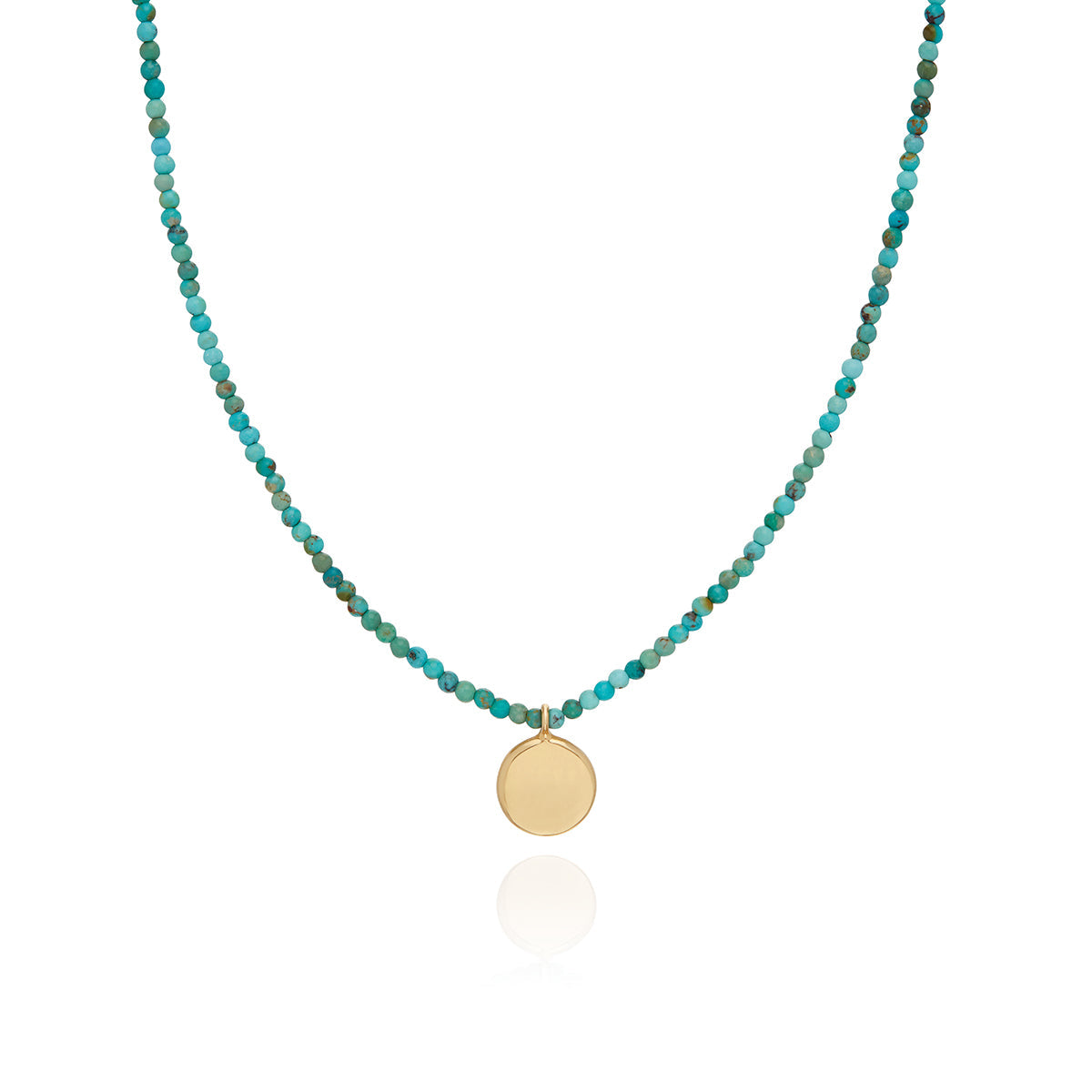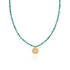 Delicate Turquoise beads form the base of the Turquesa Beaded Necklace, featuring our signature 18k gold pendant with handcrafted Balinese dotting work. Engrave the back of the pendant to make it your own!