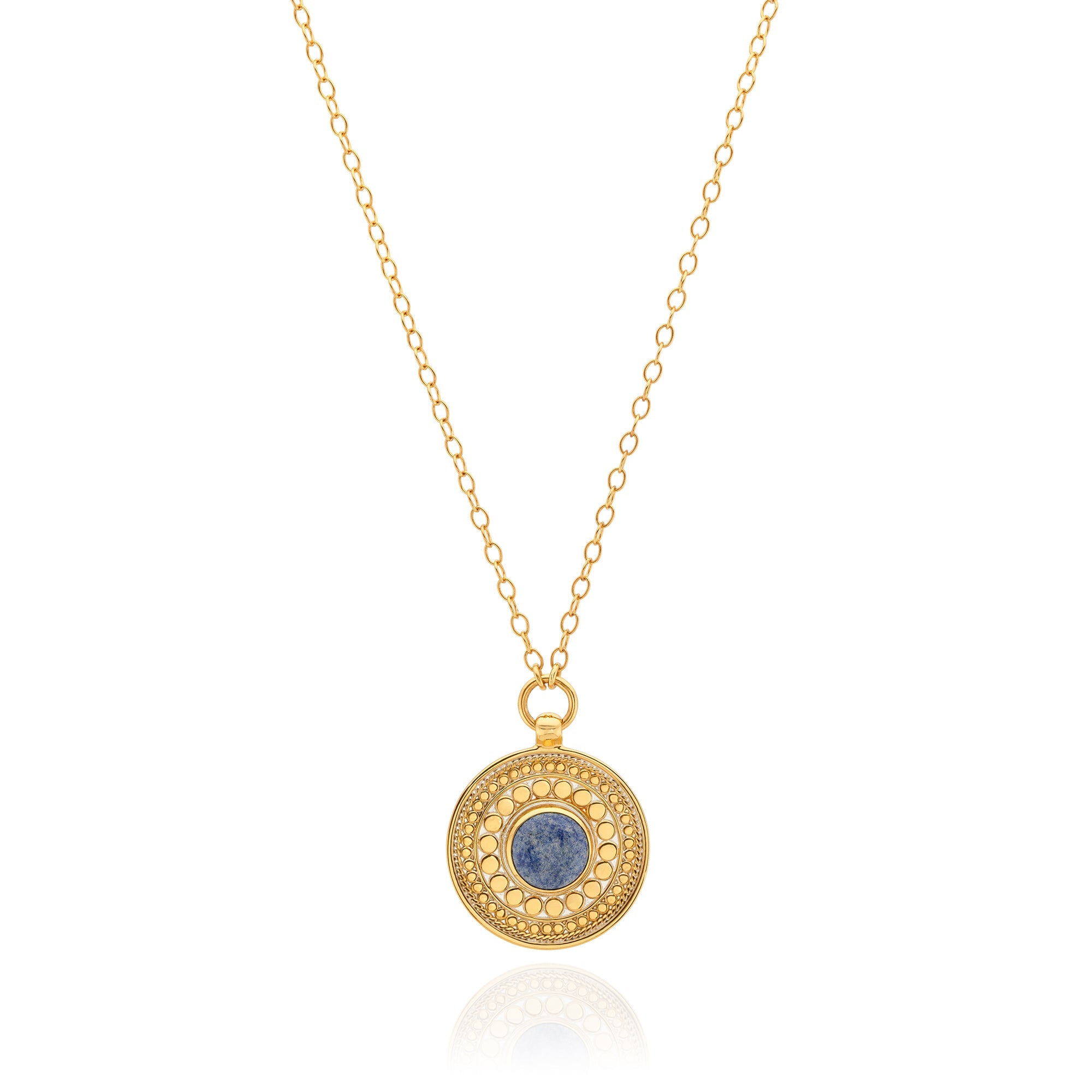 Texture radiates from the Dotted Dumortierite Pendant Necklace, thanks to alternating layers of gold braiding and dotting work. A denim-blue Dumortierite stone in the center feels like your favorite pair of jeans: timeless, classic and goes with anything.