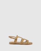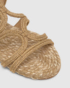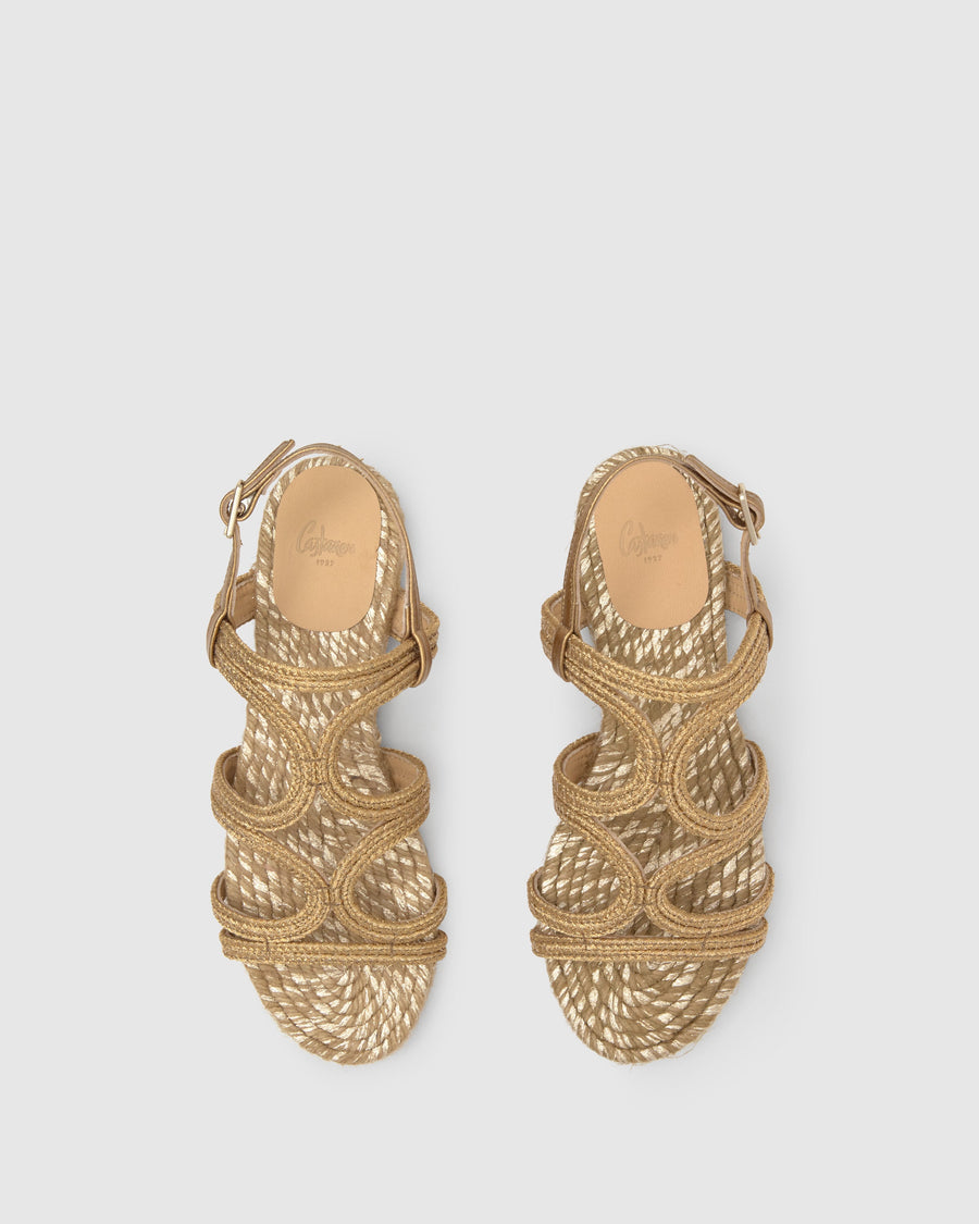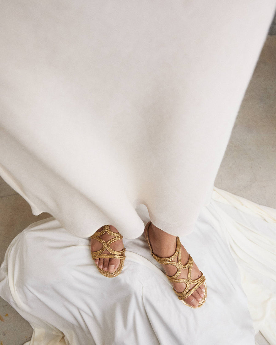Pitra flat sandal in colour Oro Viejo/Old Gold with handmade metallic braiding, buckle closure and jute insole with leather sole.