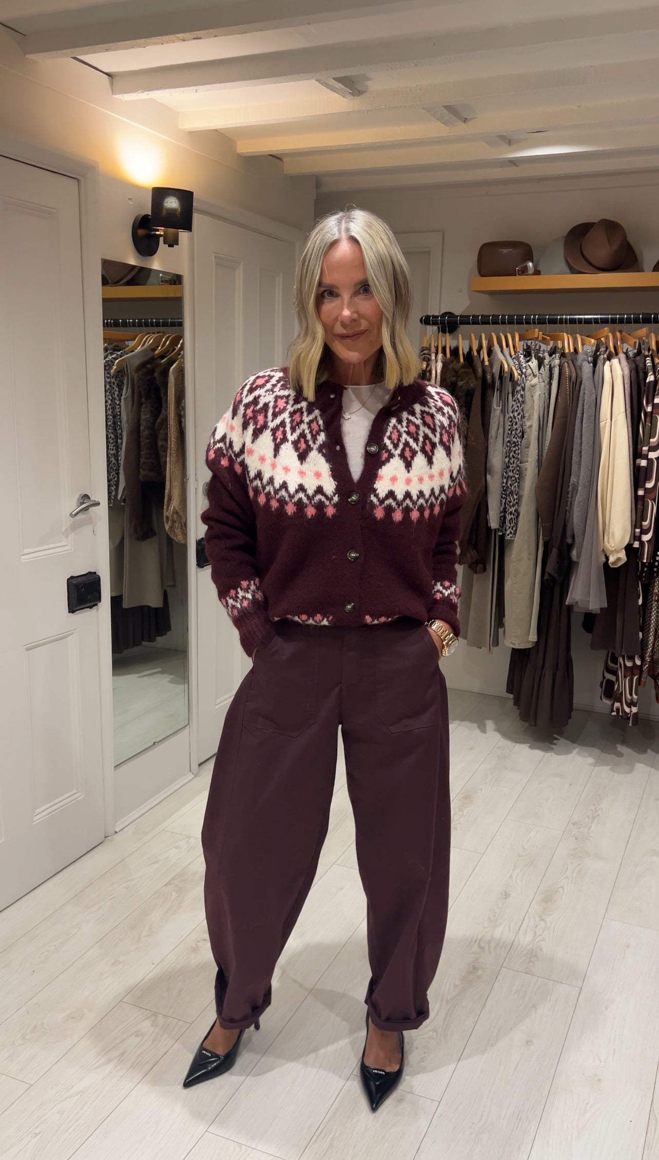 Embrace timeless style with this burgundy Fair Isle knit, a wardrobe essential that seamlessly transitions from casual days to evening occasions.