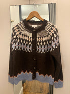 Embrace timeless style with our Fair Isle Cardi in rich chocolate. This classic knit features traditional Fair Isle patterning that elevates any outfit.
