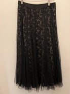 Elevate your wardrobe with this stunning tulle lace skirt, a versatile piece that effortlessly transitions from day to night. The delicate cream and black colour combination creates a sophisticated contrast, while the tulle and lace construction adds texture and movement for a graceful silhouette.