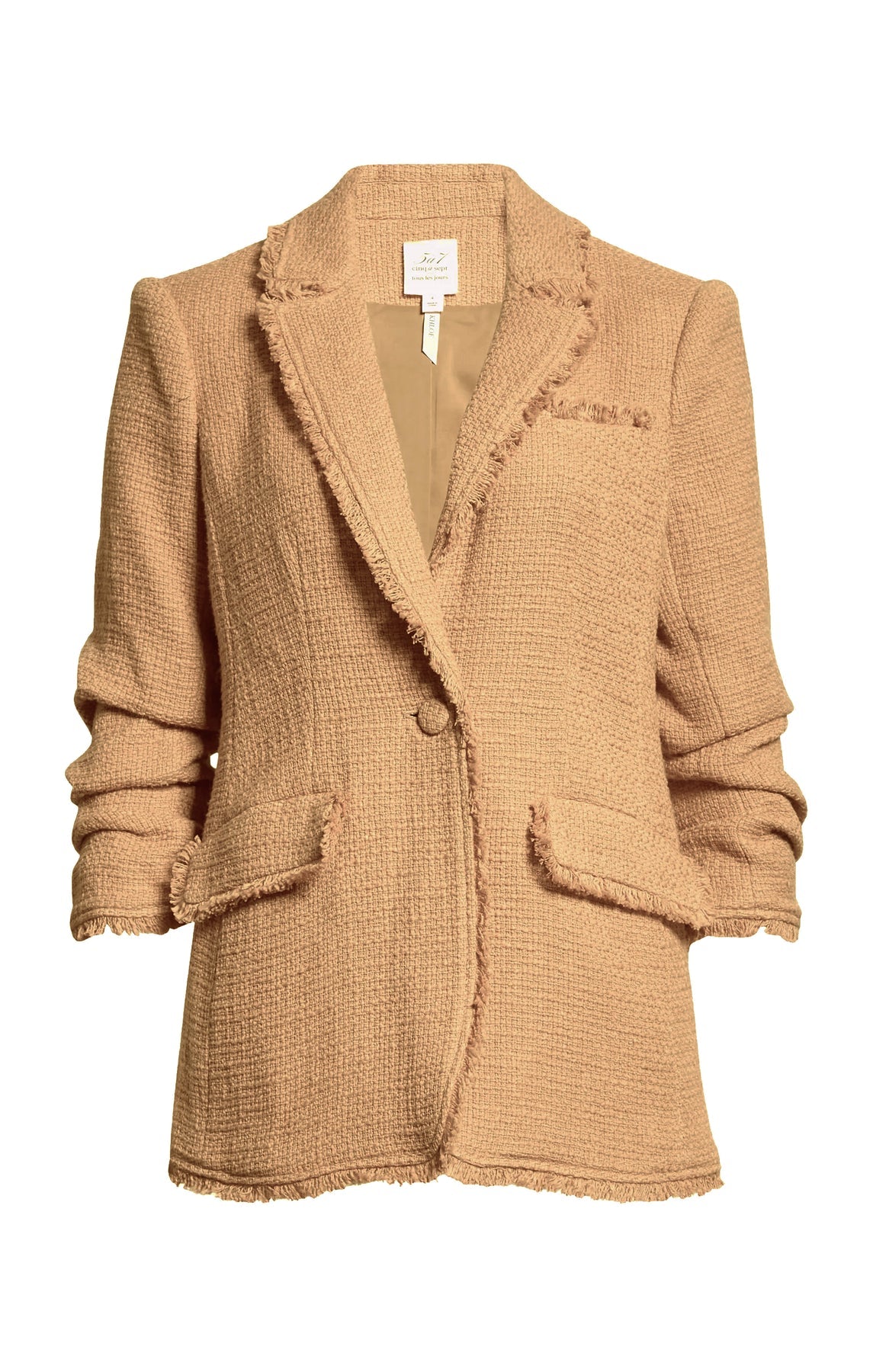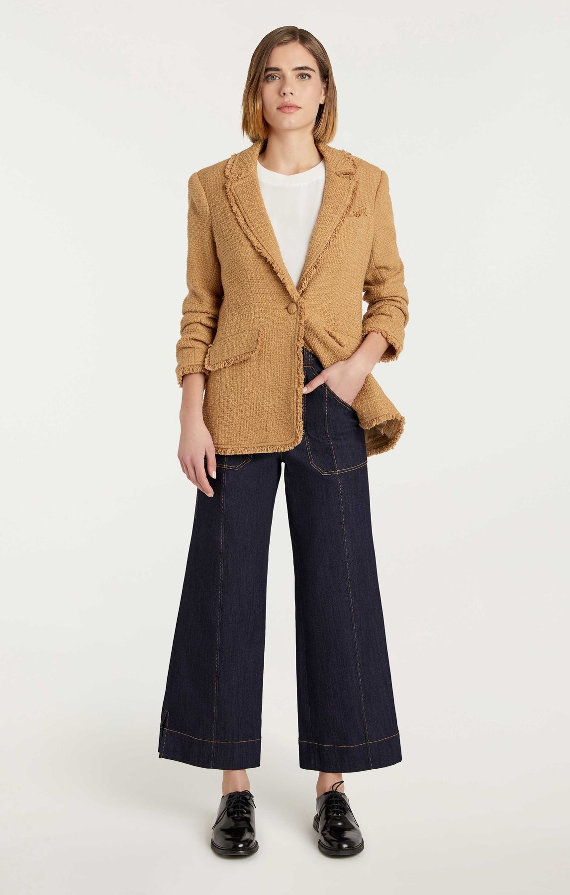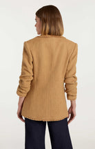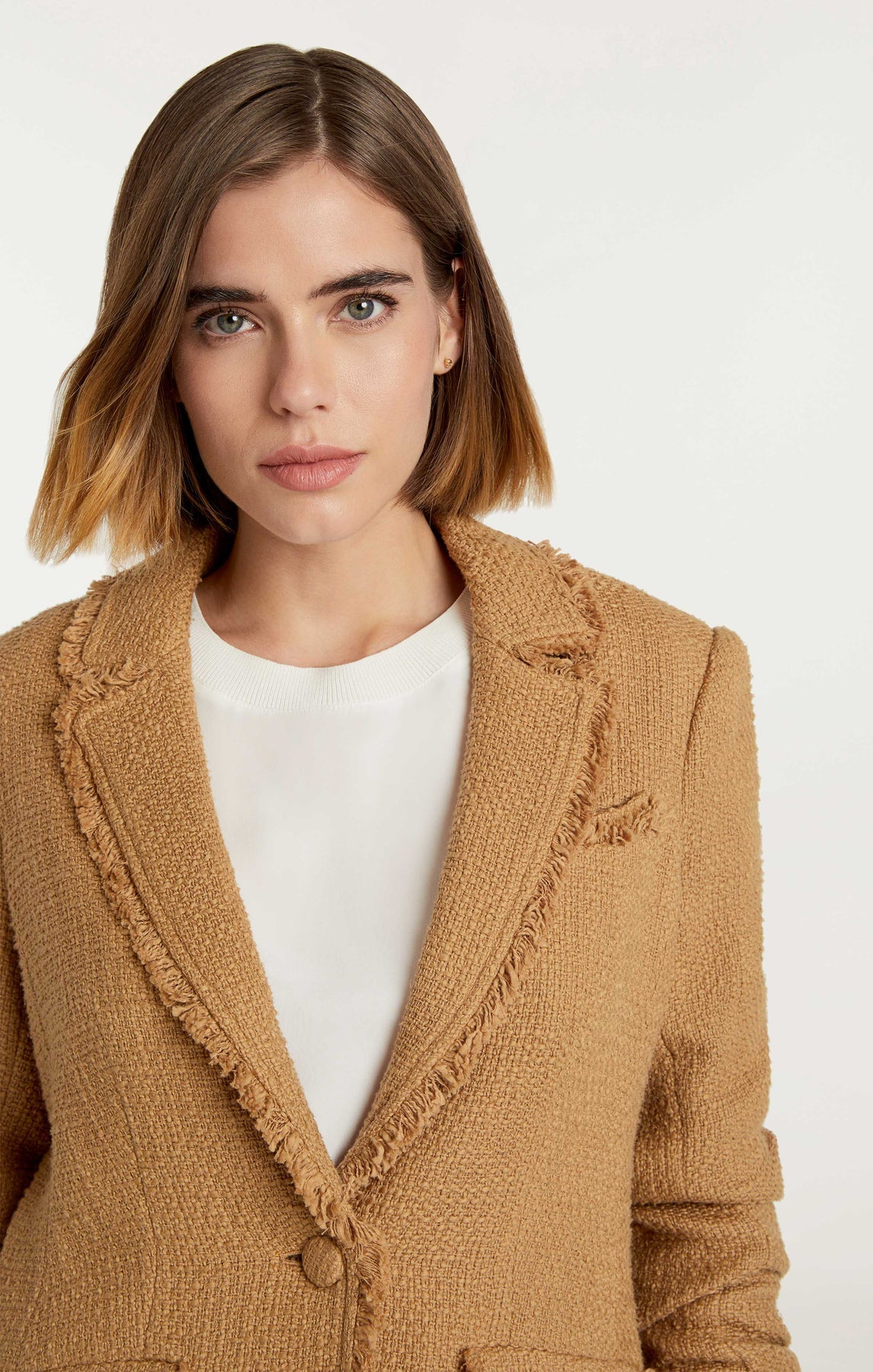 Button up the dashing Boucle Khloe Blazer and relish pre-styled sleeves and notched lapels. Its collared neckline and tailored silhouette make a statement of effortless elegance. Soft and plush fabric makes it a perfect choice for special events that call for both beauty and comfort. Make a timeless style statement with the Boucle Khloe Blazer.