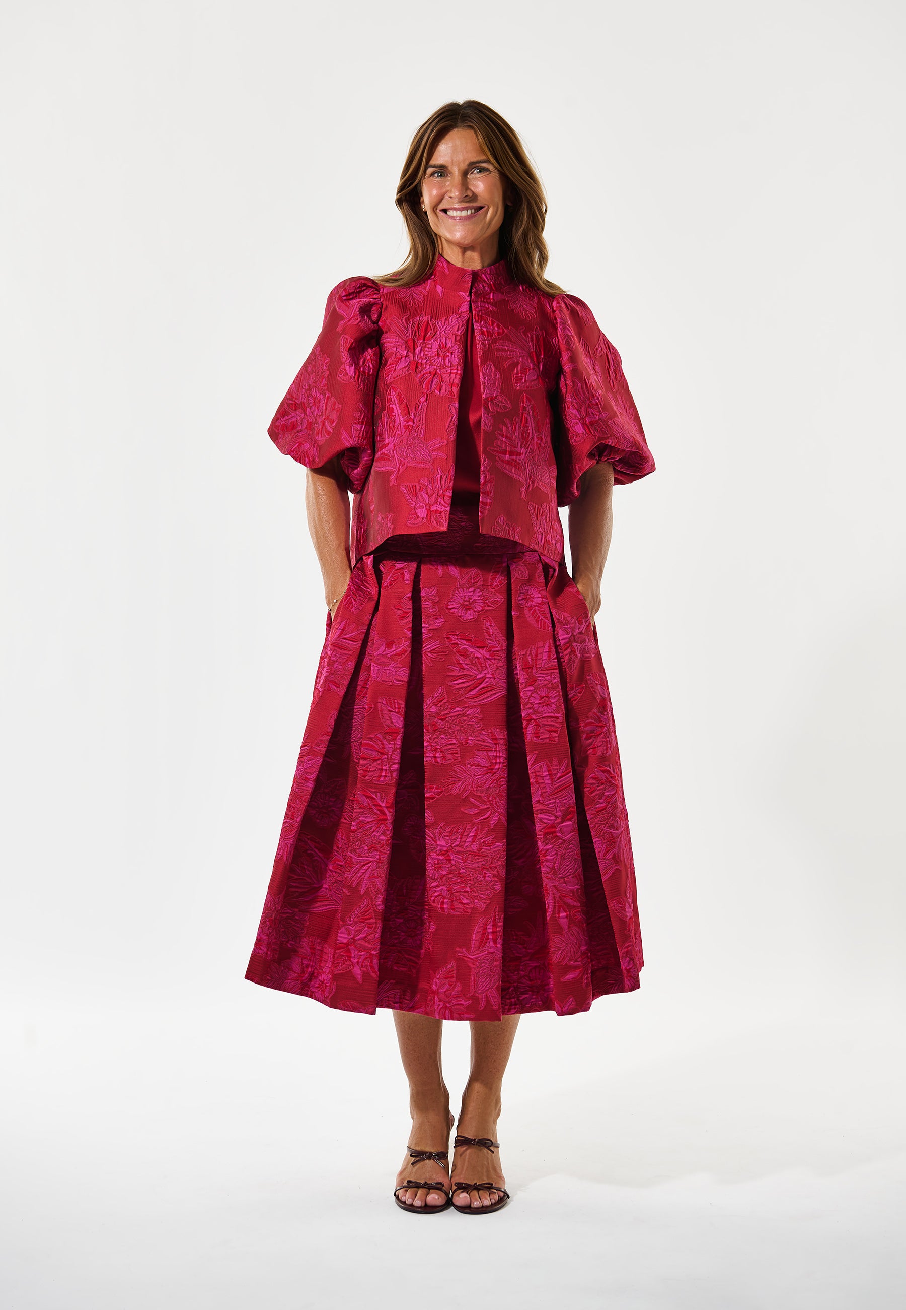 Creating a bold, sculptural silhouette, this jacket is a perfect choice for evening. With large balloon sleeves and a high collar, it is fastened at the neck with a hook and eye and has hidden pockets in the side seams. This beautiful version is in rose pink jacquard fabric.