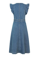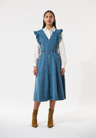 Elevating denim to a very stylish level, this dress features jean-inspired details such as a waistband with belt loops, brass zip at the side and a logo embroidery on the pocket bearer. The fitted bodice has a deep v neck and flares out to a mid calf skirt, the whole thing finished off with dramatic flounces at the shoulder.