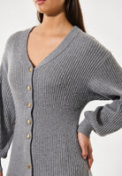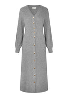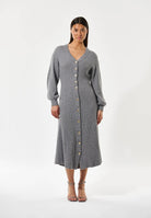 Long and lean, this luxurious grey knitted dress is fitted on the body before flaring gently to fall to ankle length. Made from a soft wool mix yarn, the dress has a deep V neck, ribbed detail at the waist and cuffs and is buttoned down the front with textured metallic buttons.