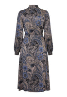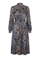 Fitted at the body and then flaring out to an A-line mid calf length skirt, this dress in silk printed with a dark paisley design is flattering and chic. It has a stand collar, full sleeves that end with a buttoned cuff and a self fabric belt finished with metal ends. The dress is fastened with a hidden side zip and a buttoned front placket.