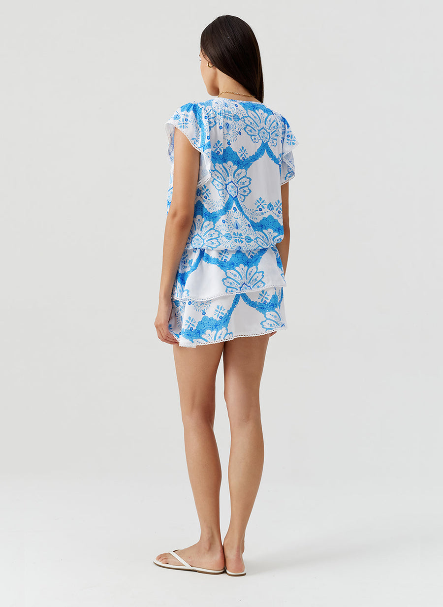 Effortlessly breezy and beautifully detailed, the Lenni Dress in Florian print is a must-have for your sun-soaked wardrobe. Cut for a relaxed, loose fit, it falls to a flattering mid-thigh length with a playful tiered skirt that moves with every step. The drawstring waist gently defines your silhouette, while flowy cap sleeves add a touch of effortless femininity. Finished with signature branded gold dome buttons, it perfectly balances laid-back ease with refined, Odabash elegance.