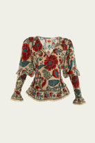 The Sand Francesca Long Sleeve Blouse embraces a vibrant floral print in warm reds and cool blues against a sandy beige canvas, crafting a lively harmony of colors. Its gently puffed sleeves give a soft silhouette, while delicate shirring at the waist and cuffs shapes the form beautifully. A charming scalloped trim edges the deep V neckline and hem, adding a playful, handcrafted touch that invites a casual yet refined spirit.
