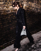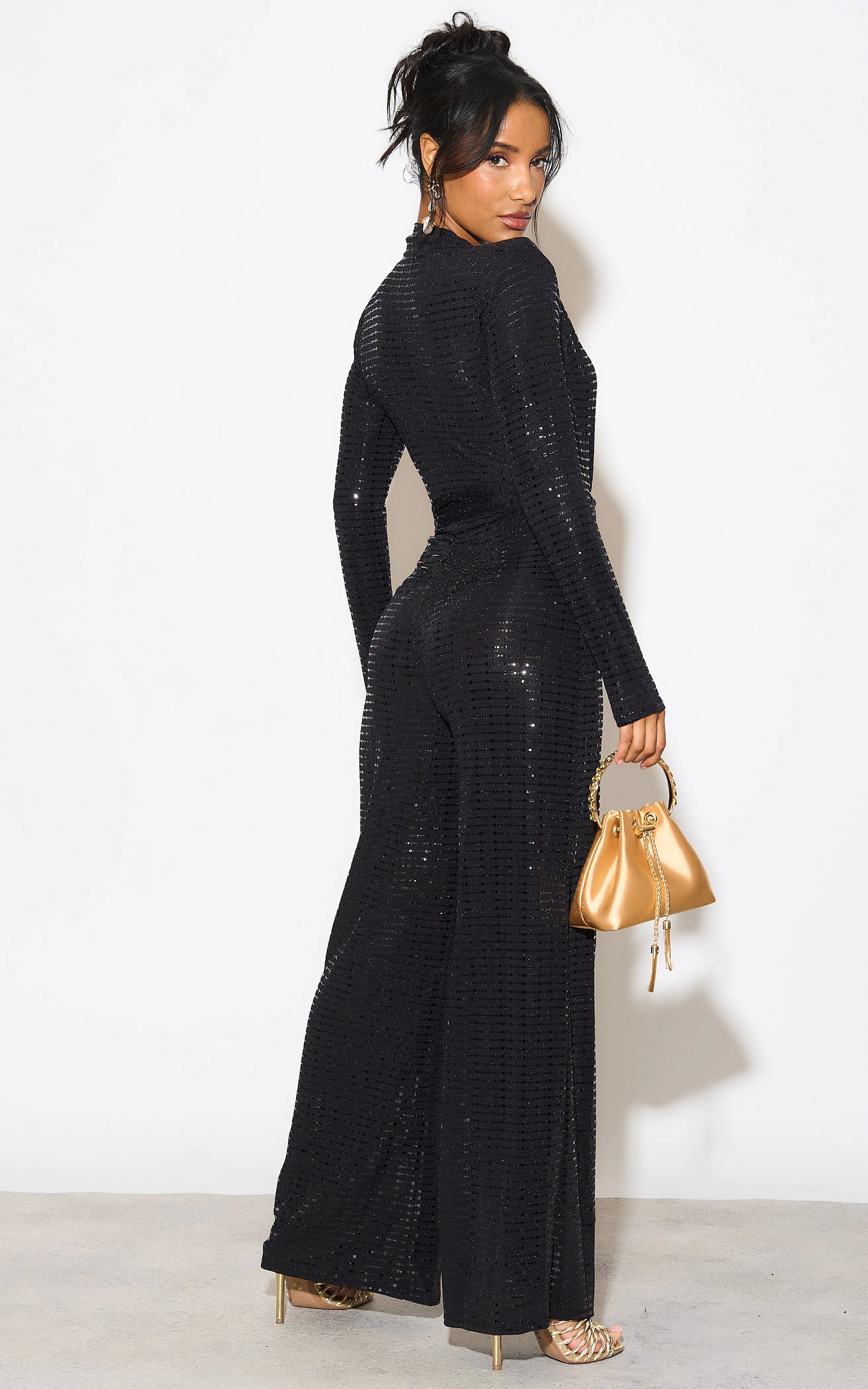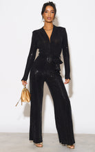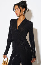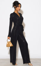 Let this stretchy black sparkle jumpsuit take you through the party period. With long sleeves, V-neck with wrapped look and a wide leg, this one is a winner. It has a tie belt to highlight the waist which you can tie at the front or back.