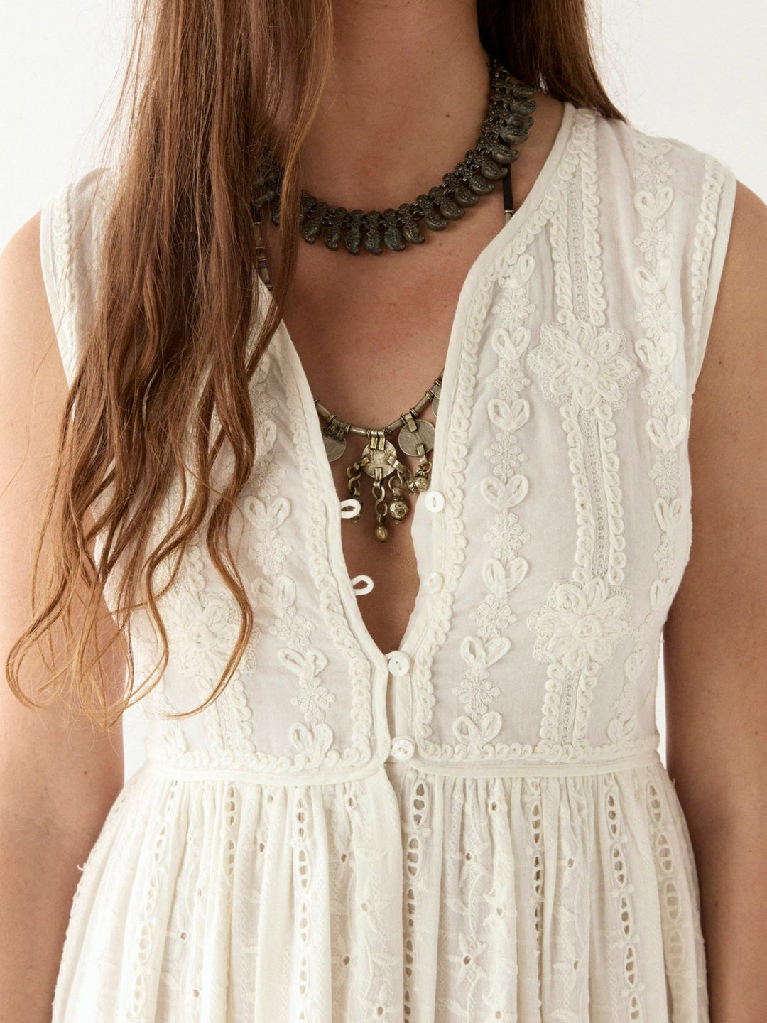 Its soft ivory fabric is laced with delicate embroidery, a quiet nod to tradition, while the flowing silhouette moves with an effortless grace. The scalloped hem brushes the ankles, and the open neckline invites a breeze—subtle details that seduce without trying.
