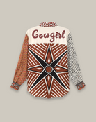 Button down, long sleeve, collared shirt with cuffs and front pocket. Sleeves have two different patterns. Cuffs are contrasting. The shirt has a different pattern on each part of the shirt and reads “Cowgirl” across the top of the back. The back is a large stylized star graphic. Pair with our matching Bailey track pants for an eye catching, artistic look.