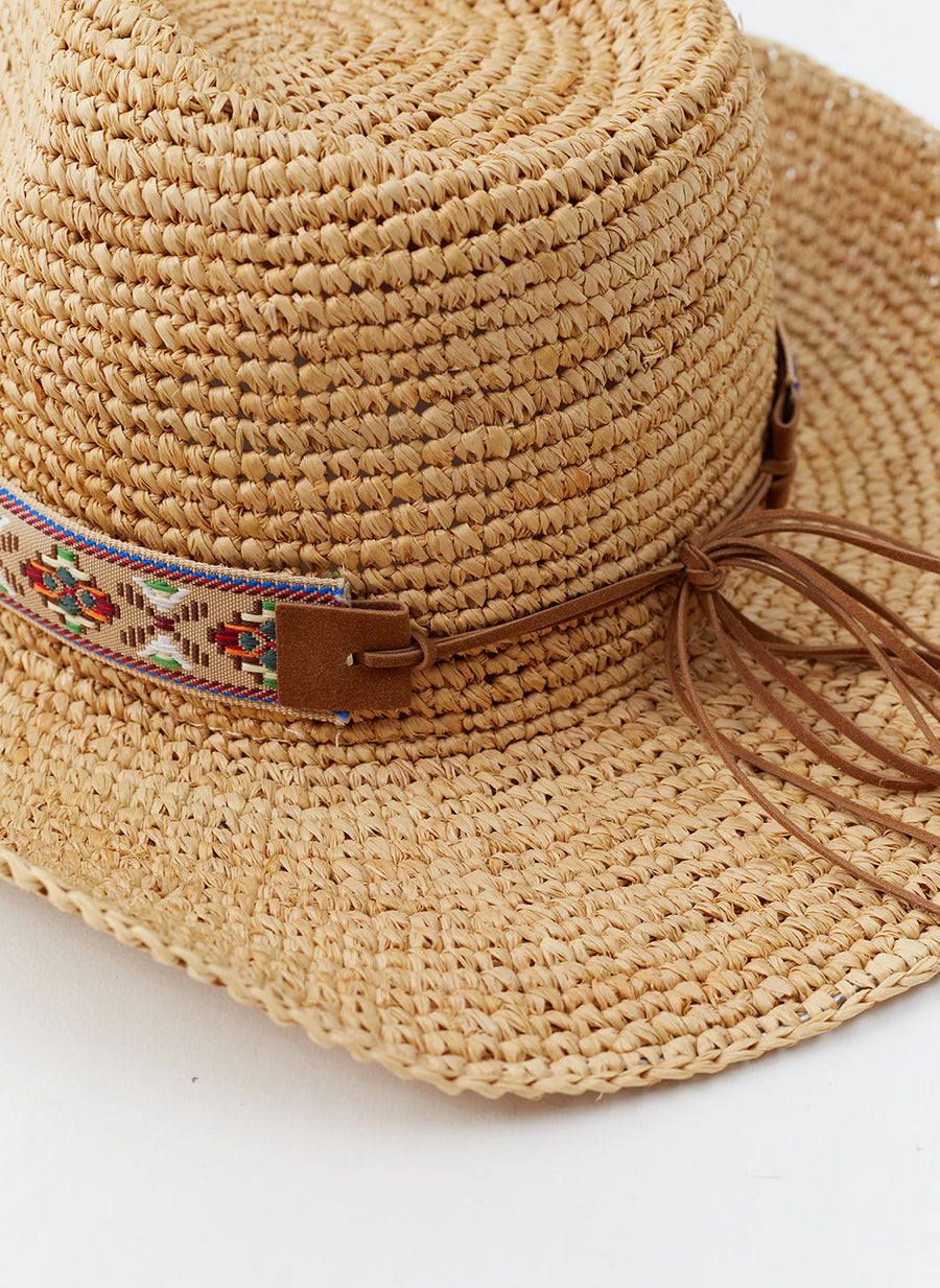 Introducing the Cara Cowboy Hat to your accessory collection, in a warm Natural ‘Tan’ hue. It features a relaxed, woven design and a wide brim that is designed to shield you from the sun. The Cara is finished with a delicate band of stunning aztec embroidery, adding a playful note to a simple silhouette.