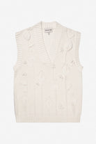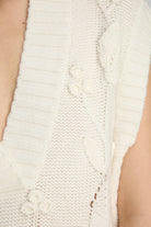 Sleeveless knitted vest with a deep V-neckline and a raised floral knit pattern. Finished with ribbed edges at the neckline, armholes, and hem.