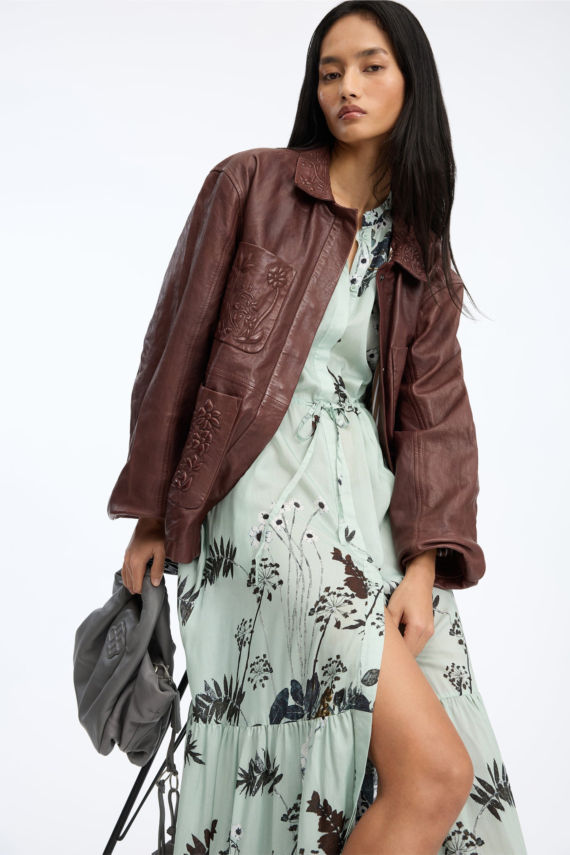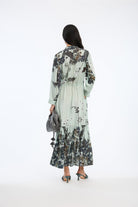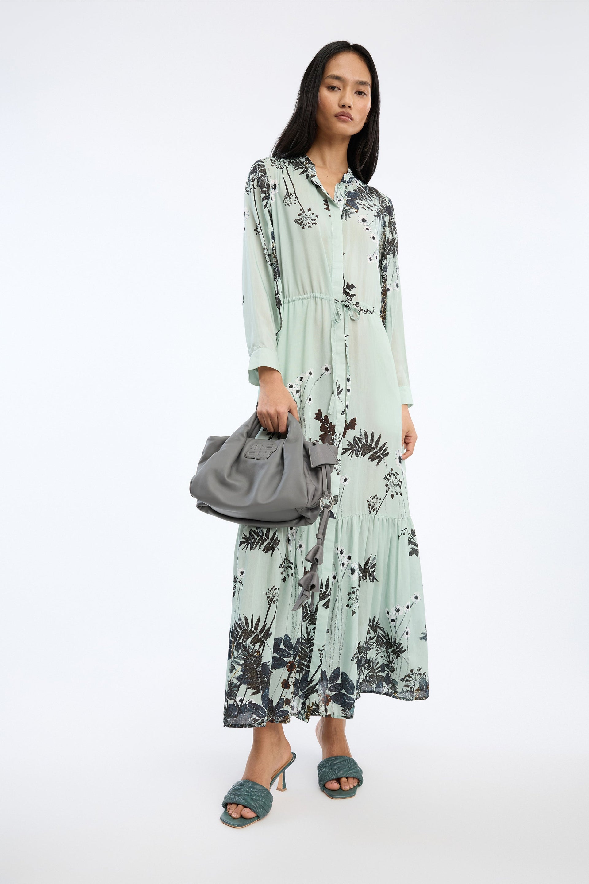 Dress crafted from a lightweight fabric featuring a botanical print. It is designed with a button-through front, long cuffed sleeves, and a drawstring that allows the waist to be adjusted.