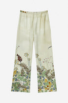 Trousers featuring a botanical print along the legs, crafted from 100% silk. The style has a straight fit, elastic waist, and soft, relaxed silhouette, offering an effortless choice for elevated everyday wear. A design that works both on its own and as part of a set styled with the matching FAIZA shirt.