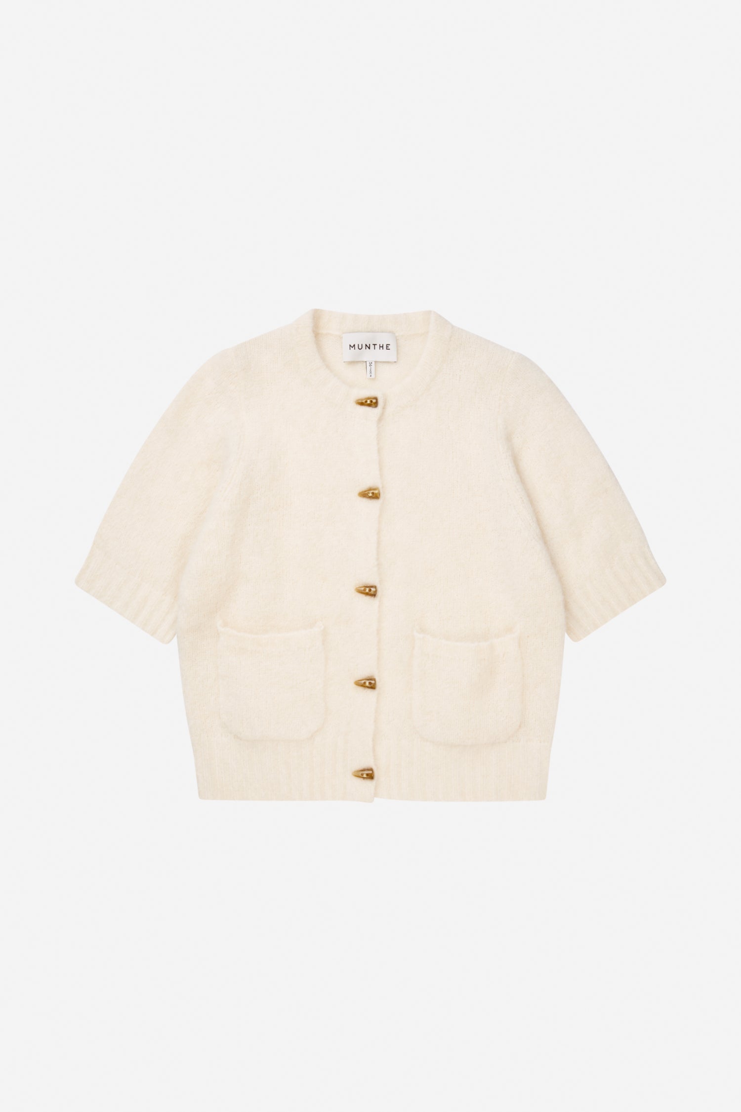 Cardigan with short sleeves, front pockets and faux horn buttons. This cardigan is designed with an elegant brushed finish and in 55% alpaca.