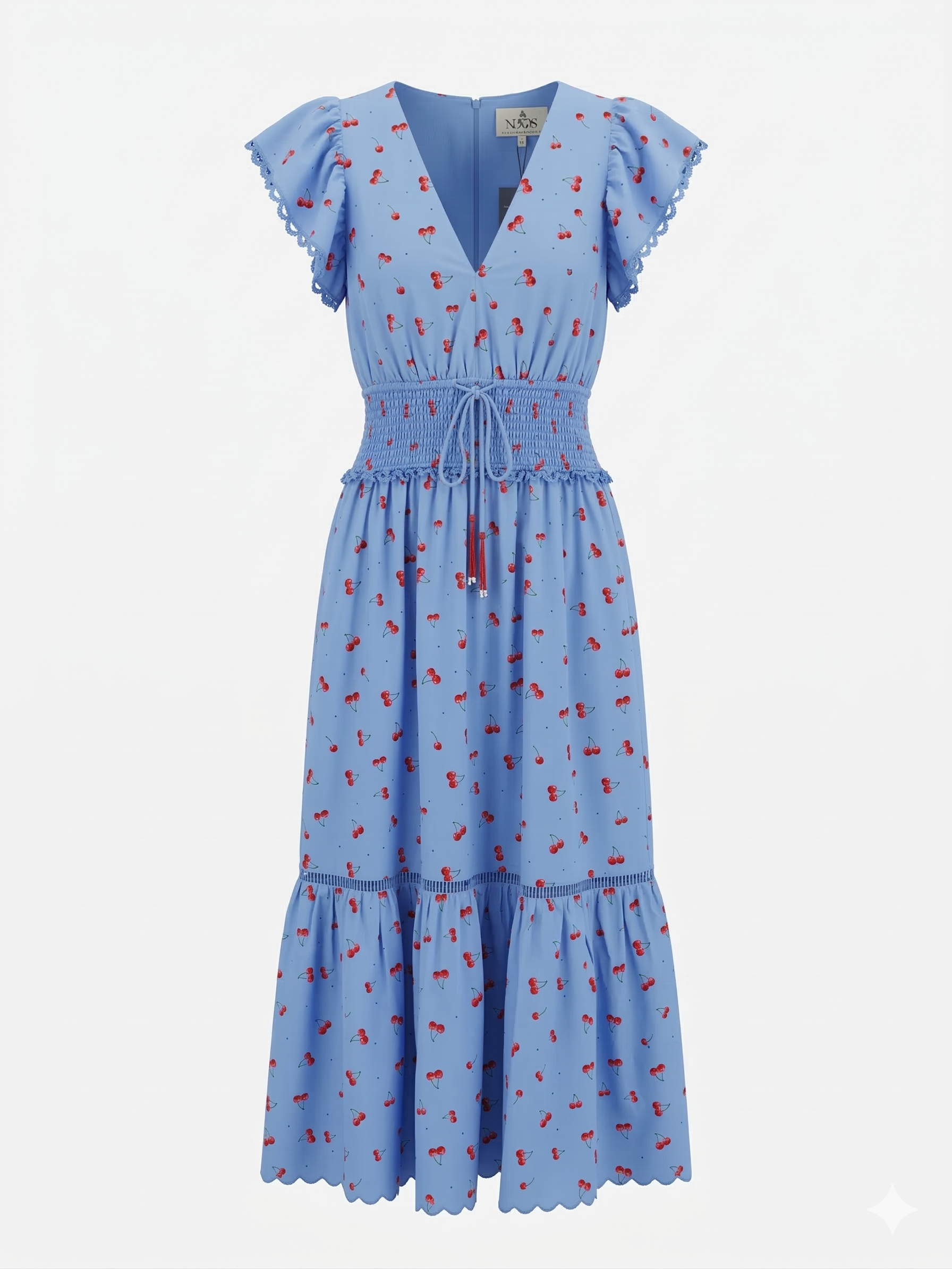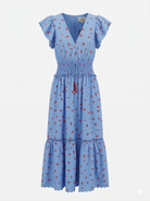 The Misha Dress features a striking blue cherry print in blue tones, perfect for adding personality to your wardrobe.