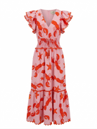 The Misha Dress features a striking lobster and starfish print in warm pink and red tones, perfect for adding personality to your wardrobe.