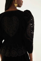 Embrace elegance with the Black Artichoke Heart Richelieu Blouse, featuring a deep V neckline that gently frames the silhouette. Its voluminous sleeves showcase intricate Richelieu-inspired cutouts and embroidery, creating a delicate play of textures. The peplum waist, adorned with scalloped edges, adds a whimsical touch while enhancing femininity. Crafted in rich black fabric, this top brings a sophisticated softness paired with playful artistry, perfect for moments that call for captivating charm.