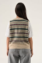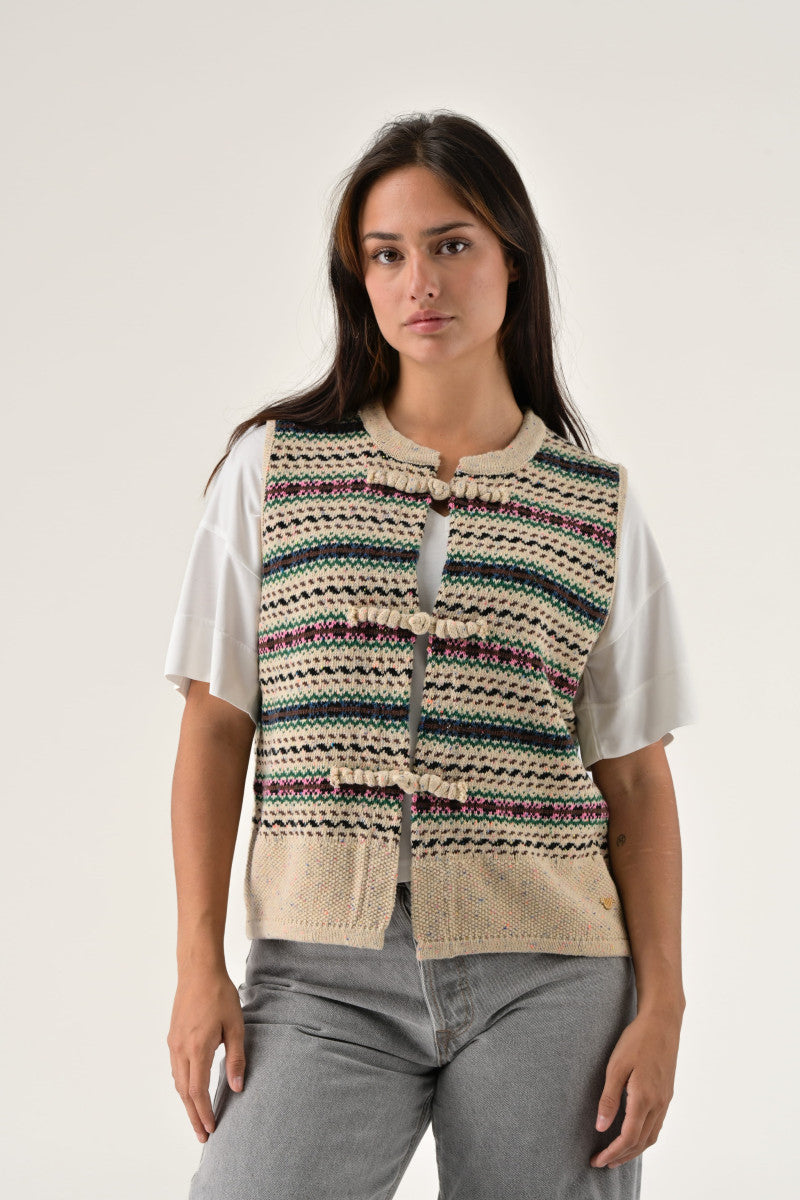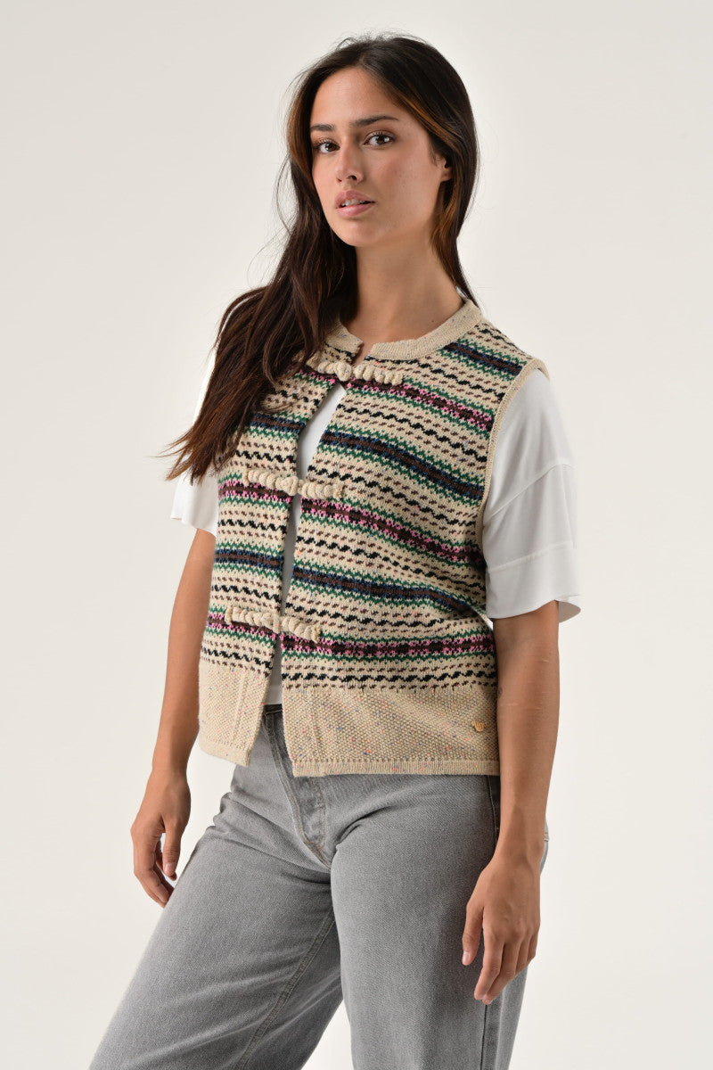 The Hailey sweater charms with its bohemian spirit and delicately retro allure. Its subtly contrasting, multicoloured striped knit adds rhythm and personality to this sleeveless piece with its strong character. The decorative button detailing at the front, inspired by handcrafted details, makes it a unique and feminine knit. Made from a soft and lightweight blend, Hailey can be worn next to the skin or layered over a t-shirt or thin shirt. Its straight cut ensures a natural and comfortable fit, ideal for warmer weather. An easy piece to incorporate into your summer wardrobe, true to the free and adventurous spirit of ORFEO Paris. Paired with high-waisted trousers or a flowing skirt, Hailey adds a touch of texture and color with a gentle touch. We love: its handcrafted striped knit, its decorative button detailing, and its bohemian chic style, perfect for summer.