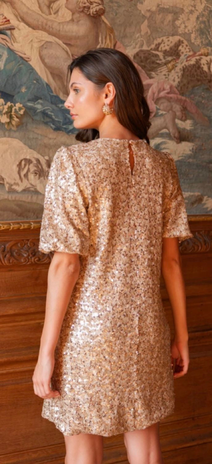 Y 08386 Sequin Puff Sleeve Dress - Gold