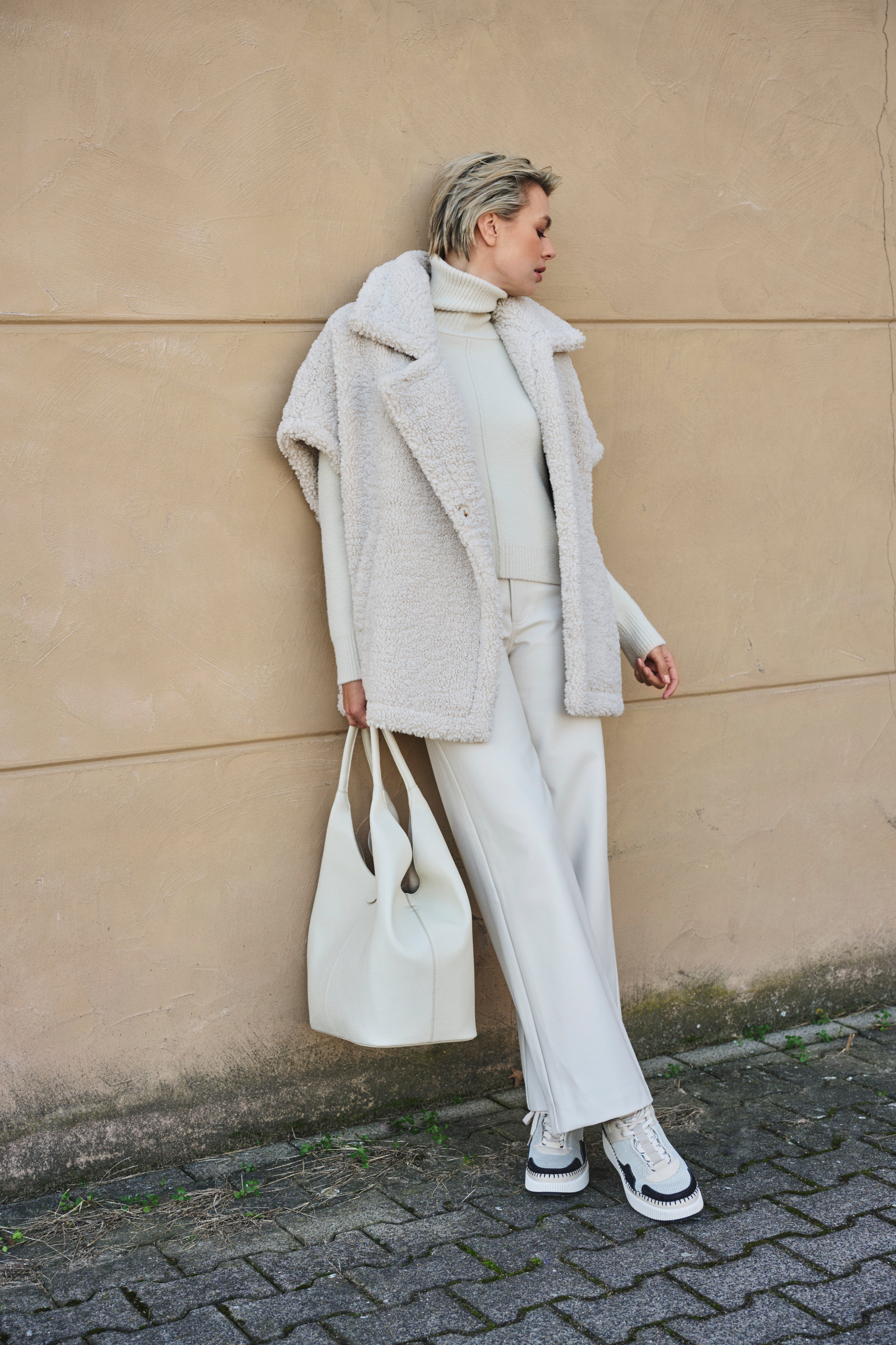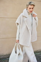 Soft and luxurious teddy cape. This boxy cape features side slit pockets, a button closure, low shoulder lines and a lapel collar. This beautiful cape is perfect for layering.