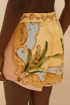 Embrace the tropical charm with the Banana Royalty Kalendoscope Multicolour Shorts by FARM Rio. These shorts feature a lively botanical print infused with swirling patterns and warm hues of yellow, green, and pastel. The relaxed fit, complete with a softly gathered waistband and delicate tassel detail, adds a playful touch. Perfect for sunny adventures, these shorts bring a vibrant splash of nature-inspired elegance to any ensemble.