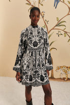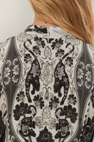 Embrace the unique fusion of nature and feline elegance with the Off-White Flower Leopards Mini Dress. Its high neckline and billowing sleeves create a sophisticated silhouette, while the distinctive leopard and floral print in monochromatic tones offers a playful yet classy charm. This piece is a delightful sartorial expression of the whimsical spirit, perfect for those who covet a touch of the wild amidst their feminine wardrobe staples.