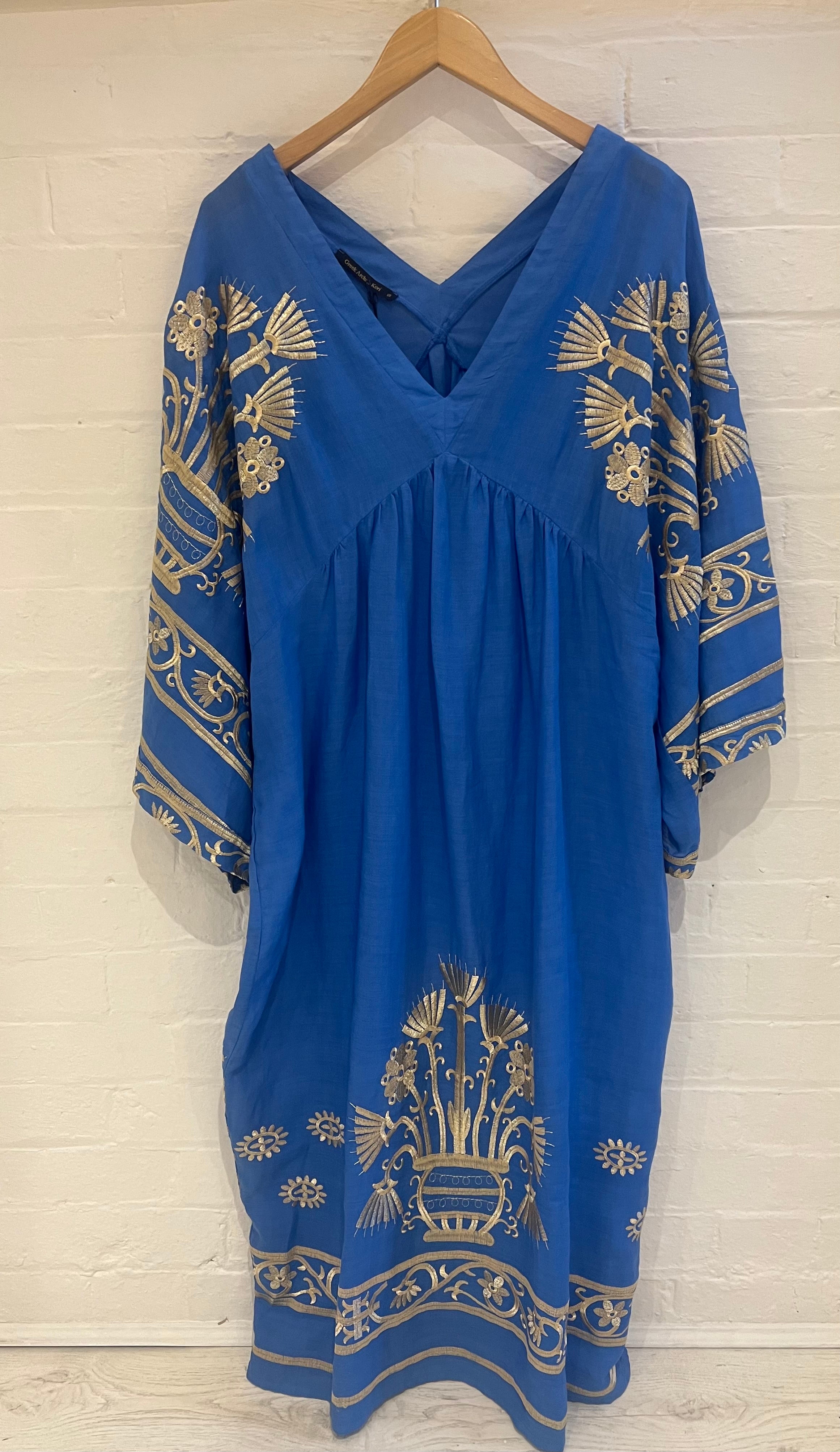 430582 Long Crete Bell Sleeve Dress - Blue Raf/Gold