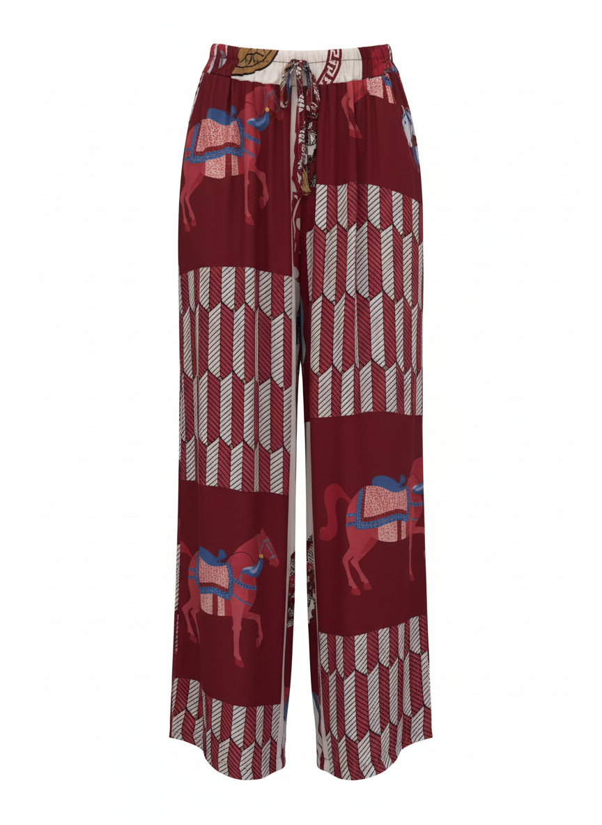 The 6637 Print Trousers in burgundy offer a stylish way to elevate your everyday wardrobe. Featuring an eye-catching print design, these trousers combine contemporary flair with comfortable wear.