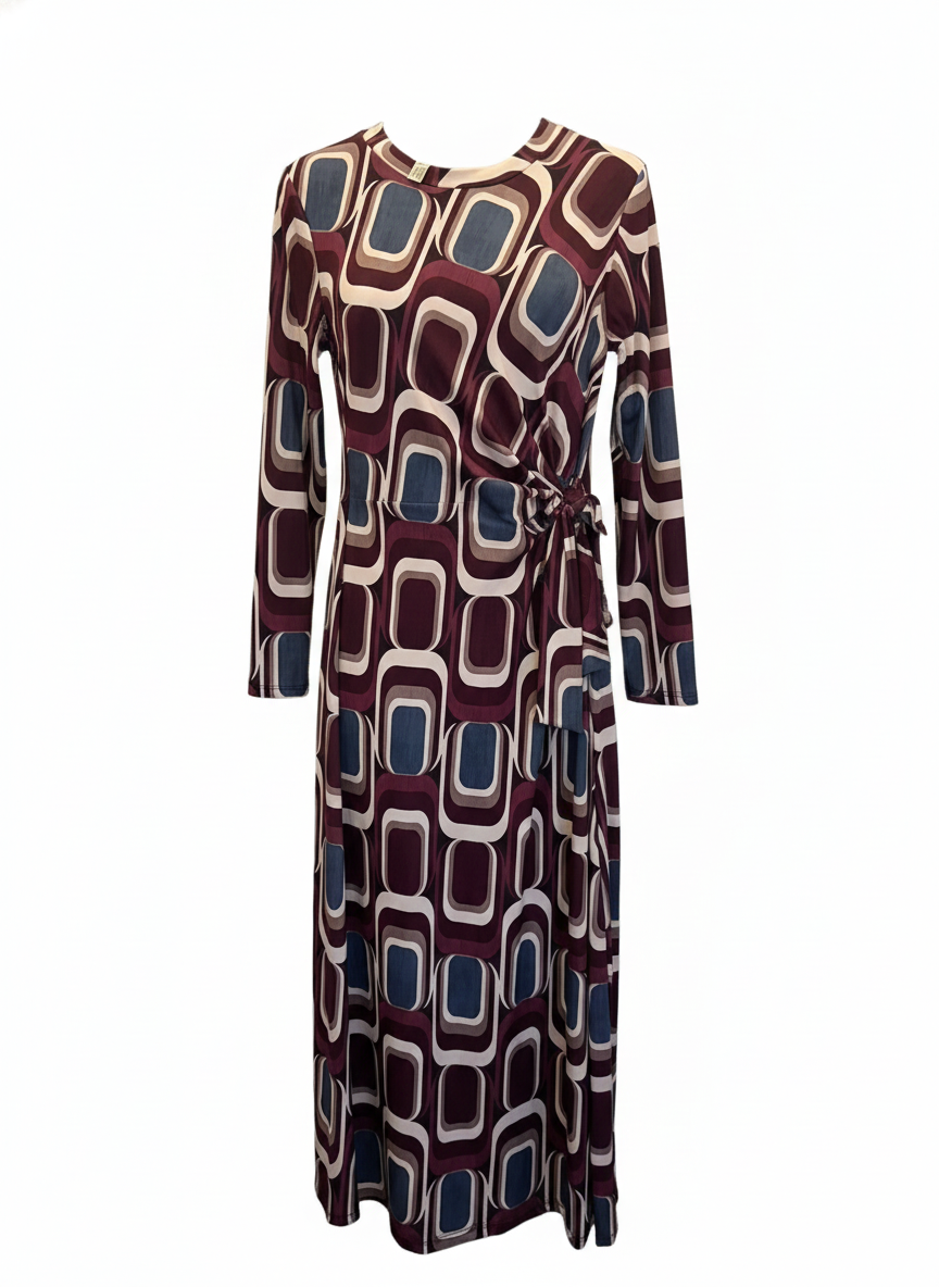 Voy 36966 Tie Side Printed Dress - Burgundy