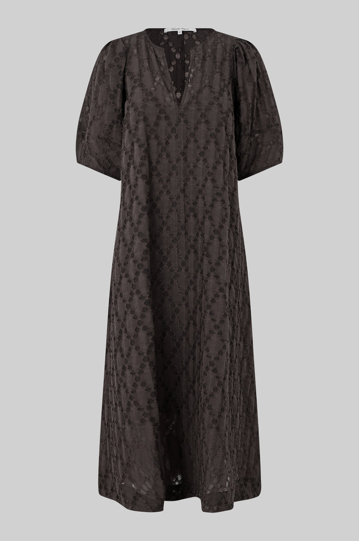 Second Female short-sleeved burnout dress. The dress is made in a viscose blend with structured pattern with semi-sheer burnout effect. Featuring a V-neckline and square shoulder seams with short puffed sleeves. Detachable slip with adjustable straps. Slim fit at the top with A-line silhouette.
