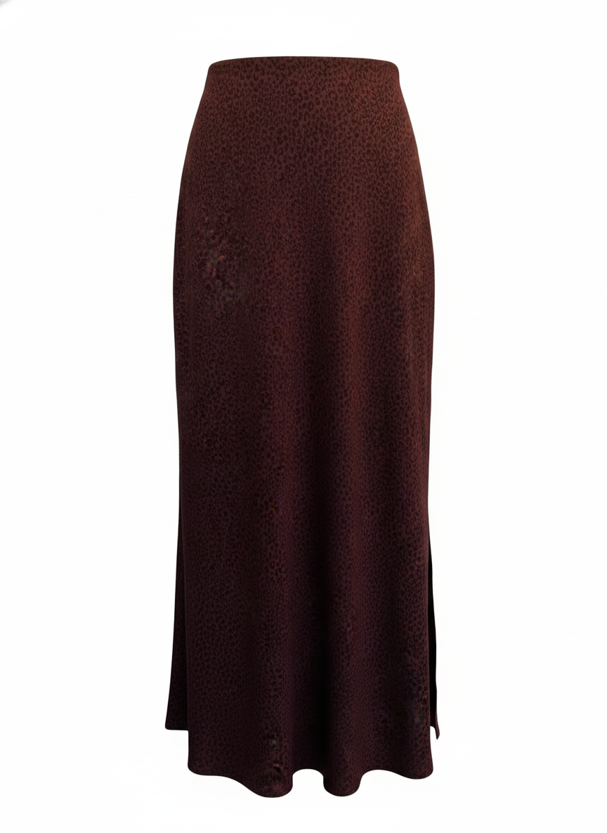 Elevate your wardrobe with this stunning leopard silky skirt in rich burgundy. The luxurious silk fabric drapes beautifully, creating an effortlessly sophisticated silhouette that transitions seamlessly from day to night.