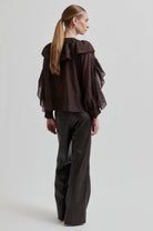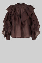 Second Female frill blouse. The blouse is made in lightweight, semi-sheer fabric. Featuring a keyhole opening with button fastening at the front. Diagonal frills at front and sleeves. Long sleeves with buttoned cuffs. Relaxed, airy fit.