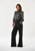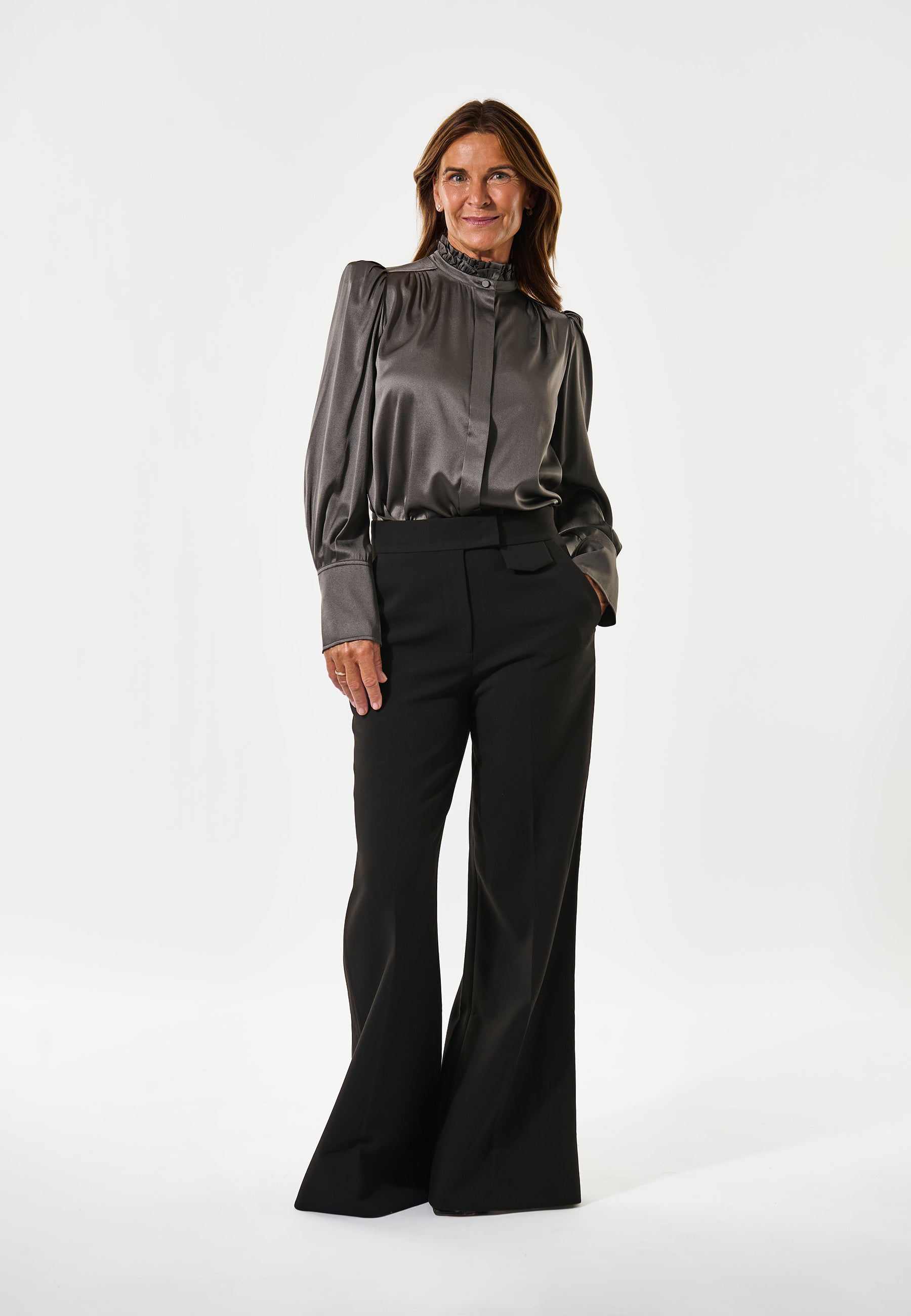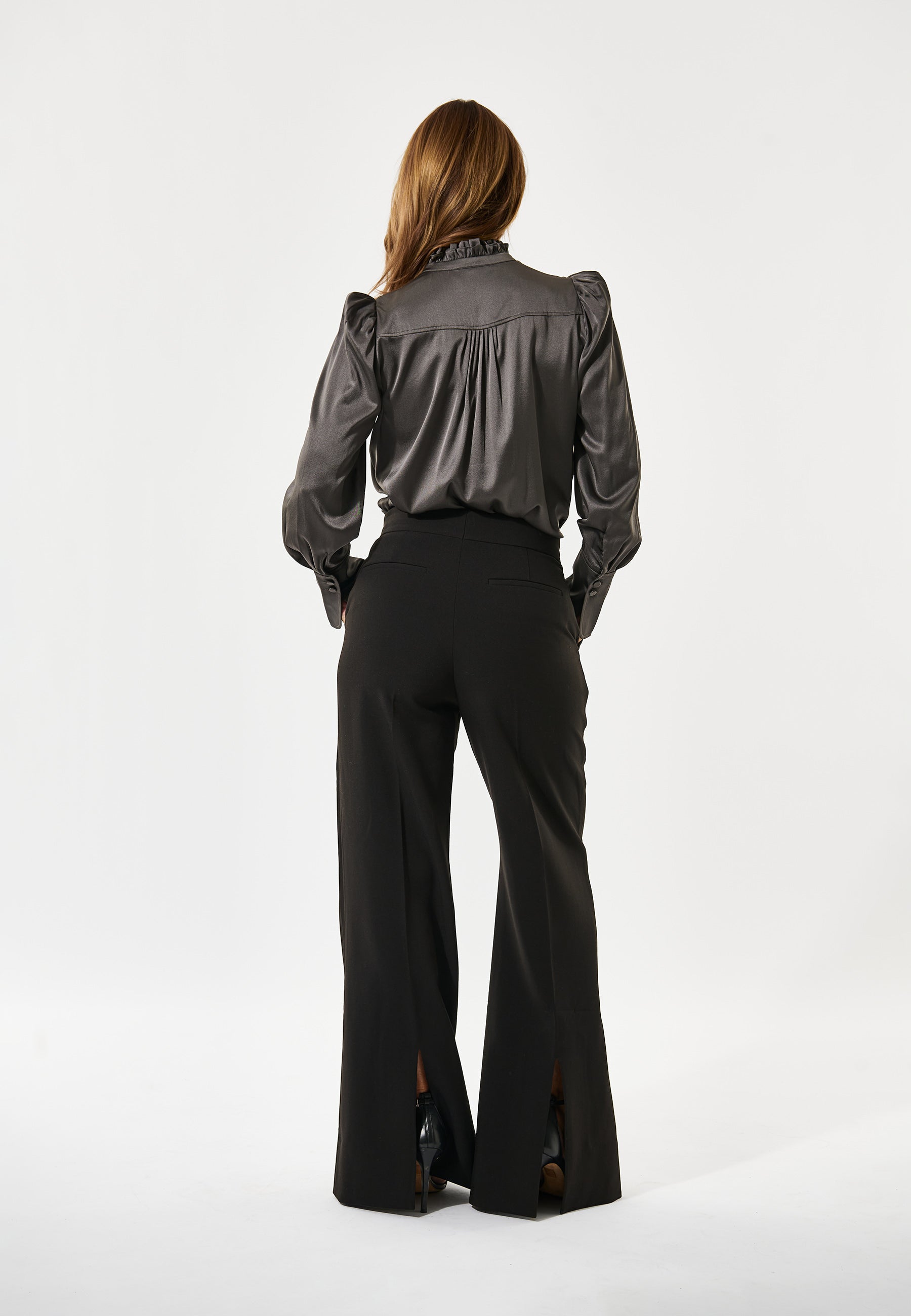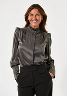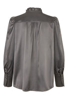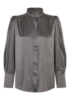 A double row of ruffles at the neck of this regular fit blouse give an added element of femininity that makes it a sophisticated and chic choice, made all the more luxurious in a hued satin silk. Detachable shoulder pads give soft structure to the puff sleeves whilst small tucks at the front and back add a little volume.