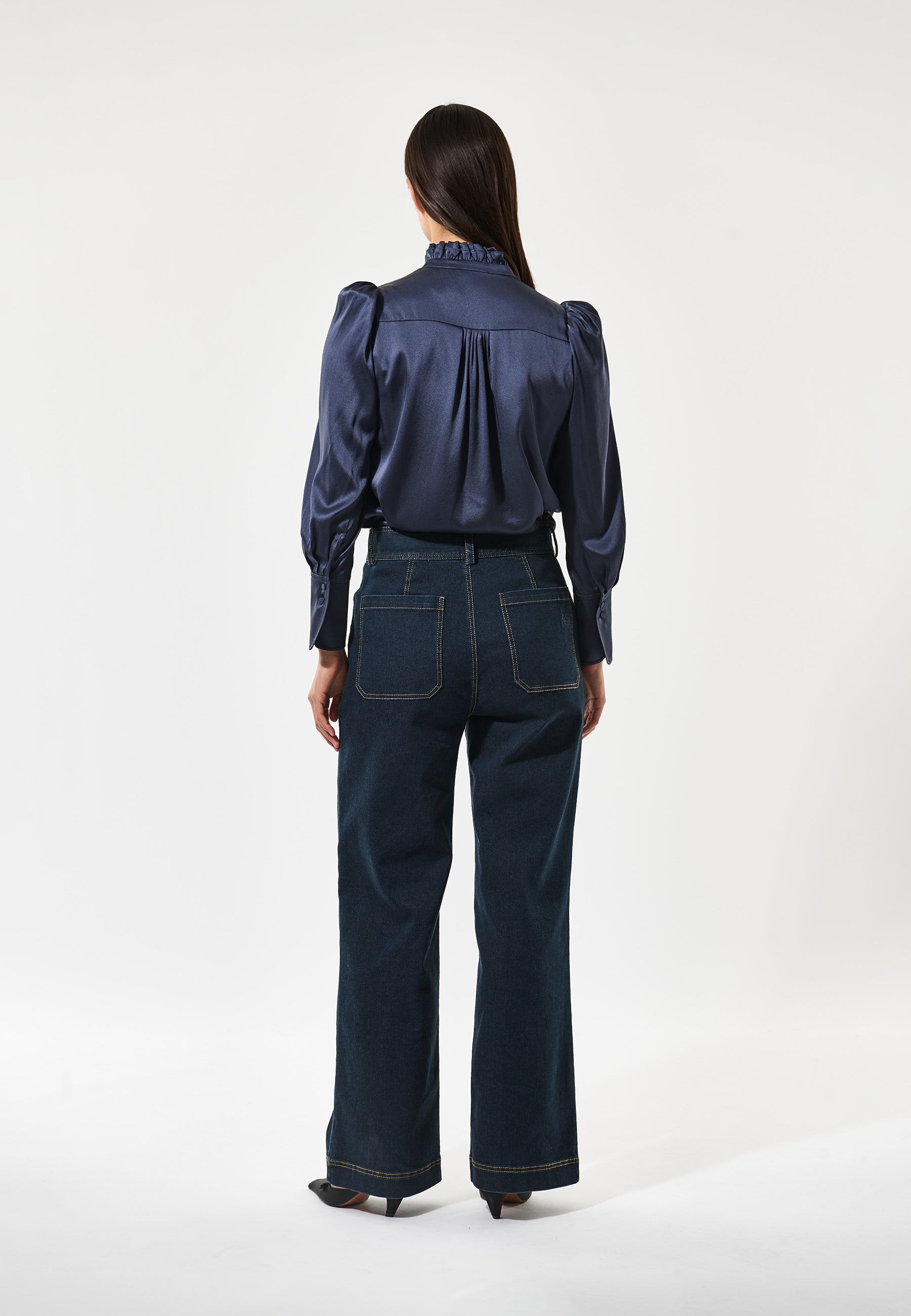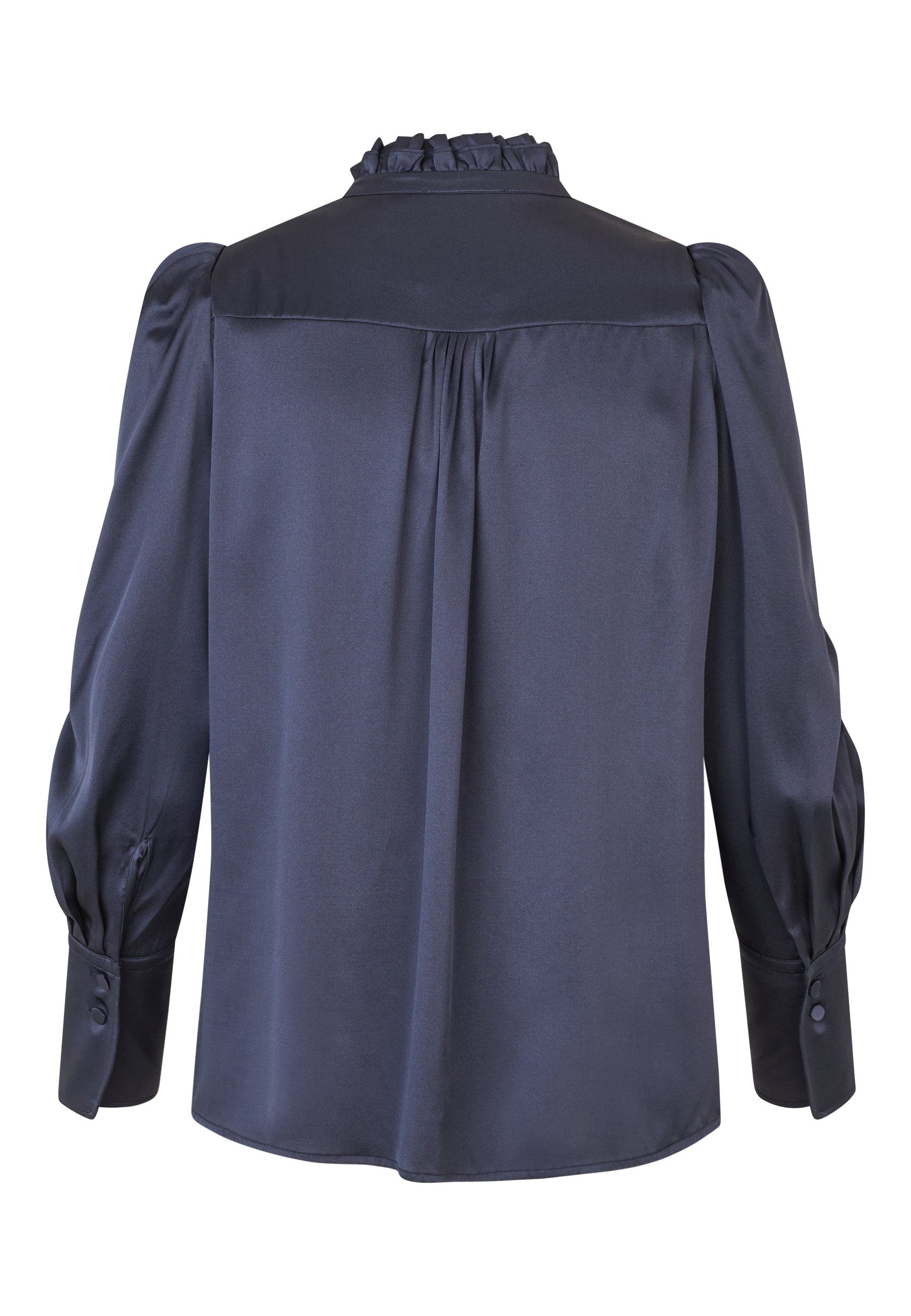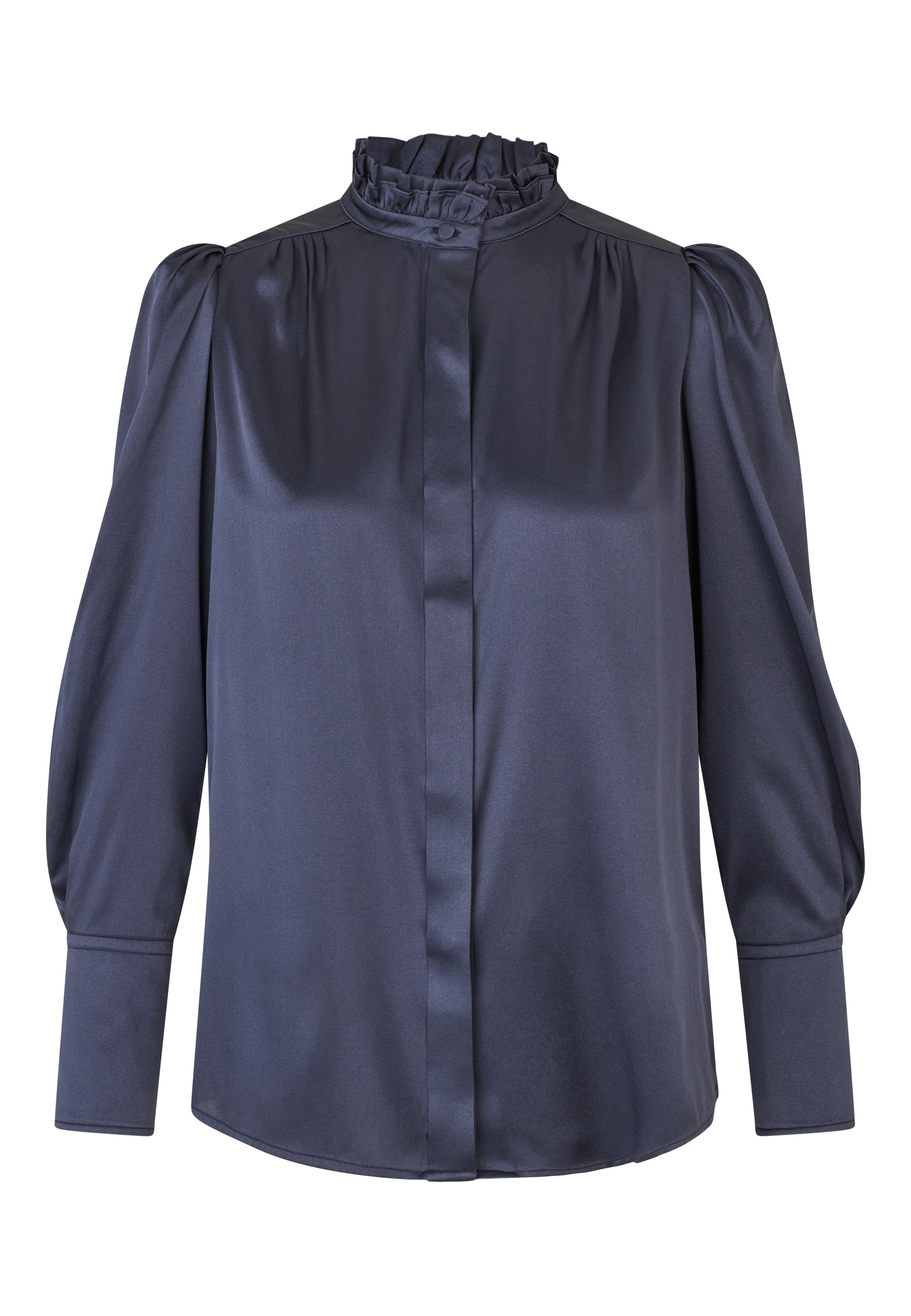 Stretch Silk Twill Shirt blouse with ruffle details. This sophisticated and elegant blouse in deep navy blue silk has two frills creating a stand collar and covered buttons down the front. Small tucks appear at the front and back neck and there are detachable self fabric shoulder pads.