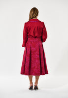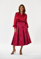 A tiny frill trim in bold fuchsia pink running around collar and cuffs adds a quirky detail to this bright red silk shirt. Fastened up the front with elegant covered buttons, the blouse has full sleeves and gathers at the front yoke.