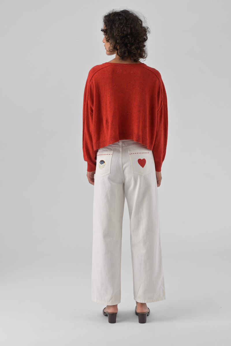 The Vinciane jeans are a key piece in the ORFEO wardrobe, both casual and distinctive. Their slightly loose, straight cut offers a relaxed look while structuring the silhouette, making them easy and flattering to wear every day. Made from 100% cotton, Vinciane stands out with its iconic embroidered details on the back: a protective eye and an embroidered heart, poetic and handcrafted signatures dear to the brand. These graphic touches add character to this timeless piece, while affirming a free and sunny spirit. Available in denim, ecru, or khaki, they can be worn with a printed blouse for a bold bohemian look or with a more understated shirt for a balanced and modern silhouette. We love: its iconic embroidery, its comfortable fit, and its updated casual style.