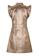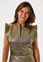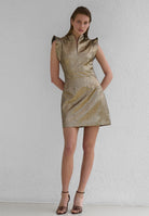 Creating a dramatic silhouette, frilled cap sleeves and a stand collar make a bold statement in this short cocktail dress. It is tight fitted across the bodice before flaring out into a bell shaped skirt. A deep v neck adds to its allure.