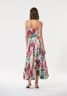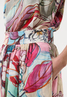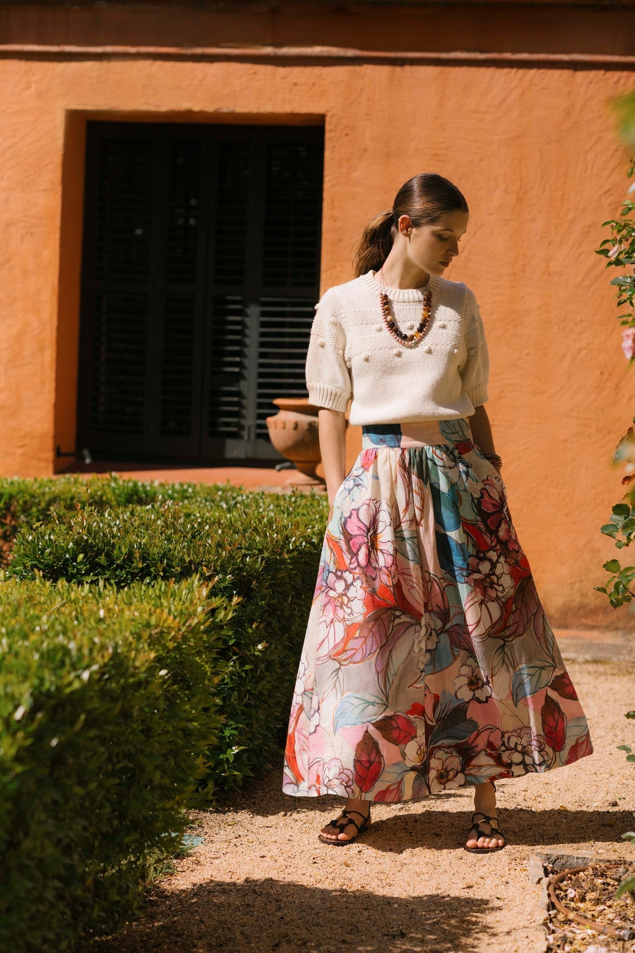 Feminine and comfortable for a summer day, this beautiful linen skirt in a bold floral print falls from a wide, high waistband to a full flared shape that ends at mid calf. It is fully lined and there are side pockets to give an easy attitude.