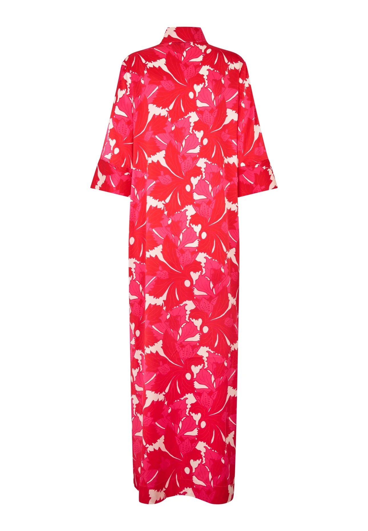 A well loved Dea Kudibal classic, Helga is a relaxed fit full length dress with a kimono style neckline, stand collar and 3/4 length wide sleeves. This version comes in silk with a bold print of enlarged leaves in shades of red and pink.