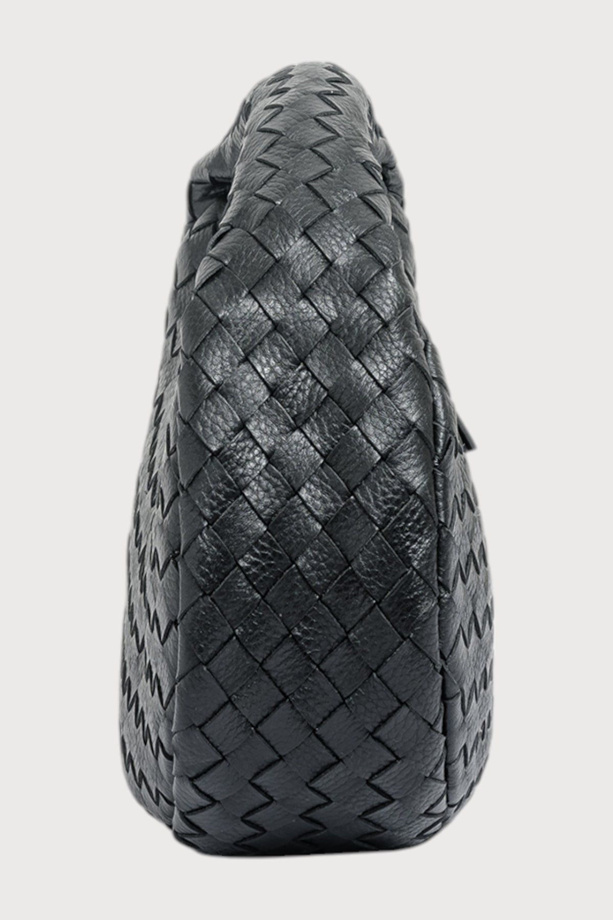 The Laluna mini bag features a woven handle, soft handwoven crossway weave and a sand coloured cotton lining on the interior.