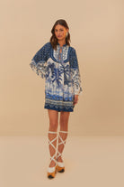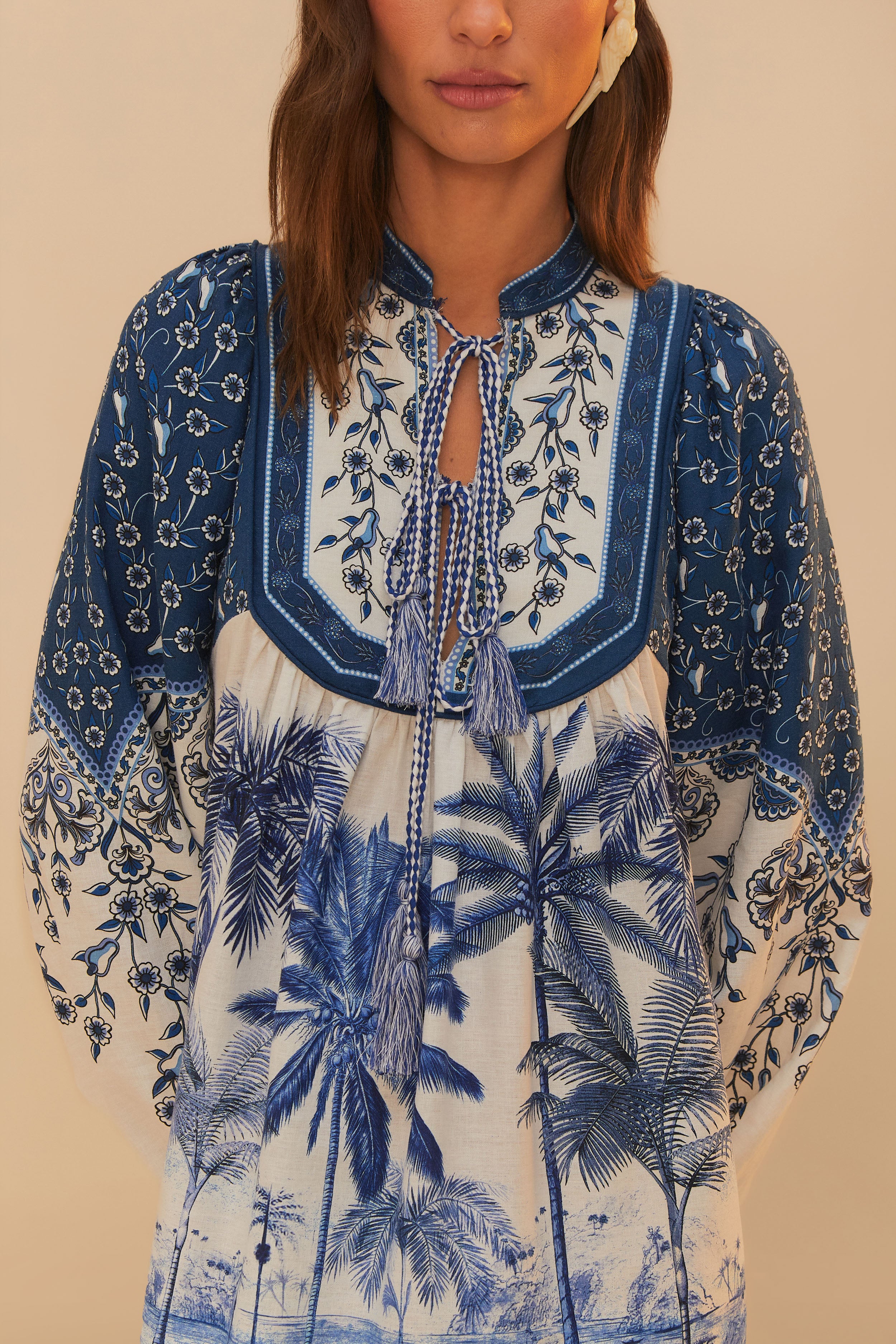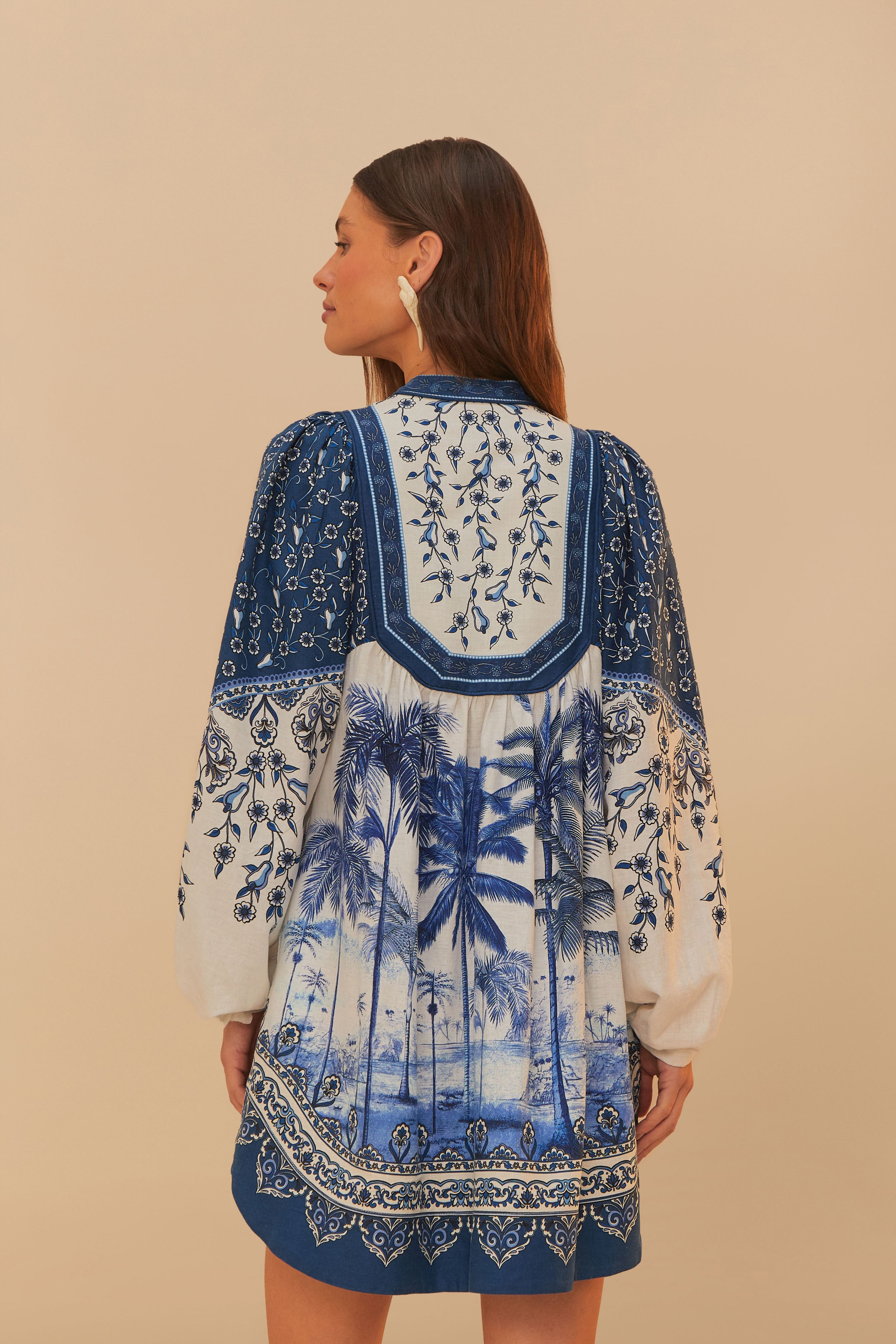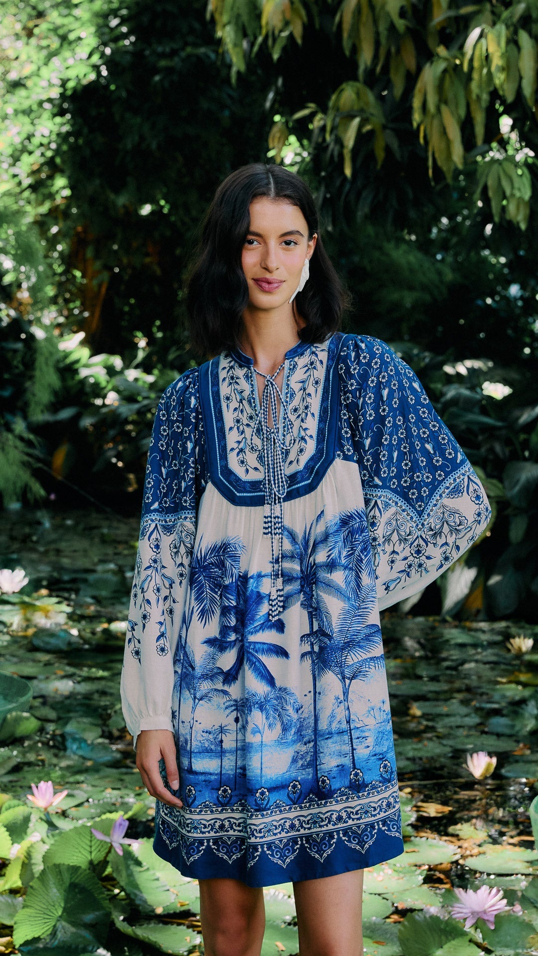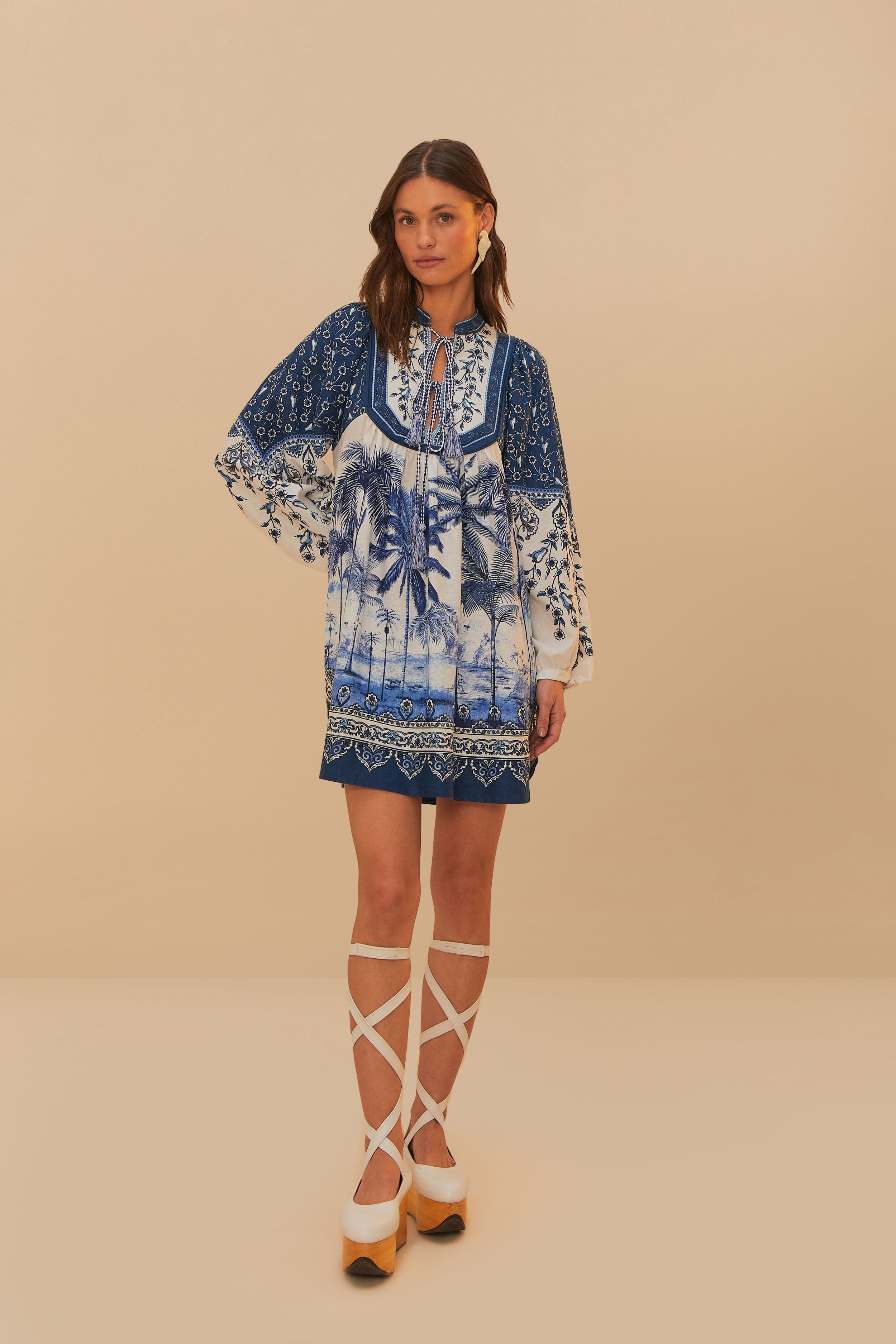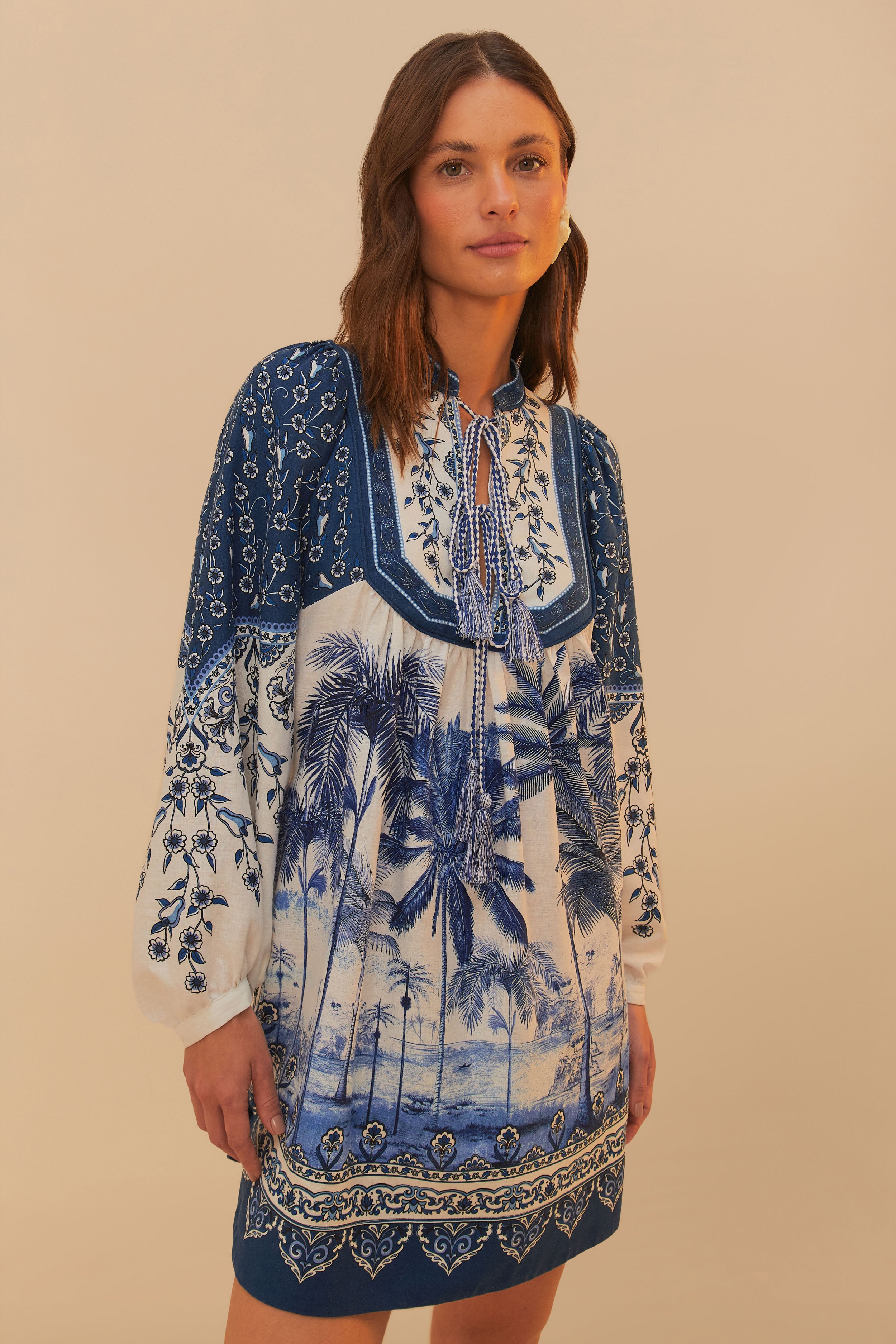 Embrace tropical allure with our Off-White Palm Tree Beach Mini Dress. Crafted from responsible materials, its captivating palm and floral motifs dance across a serene blue palette. The playful round neckline and relaxed silhouette create effortless movement. Charming long sleeves with intricate patterns bring a touch of elegance, making this a standout piece for sunlit adventures or moonlit evenings. Let your style bloom with every gentle breeze. LENZING™ ECOVERO™: the eco-responsible fibers generate up to 50% lower emissions and water impact compared to generic viscose.